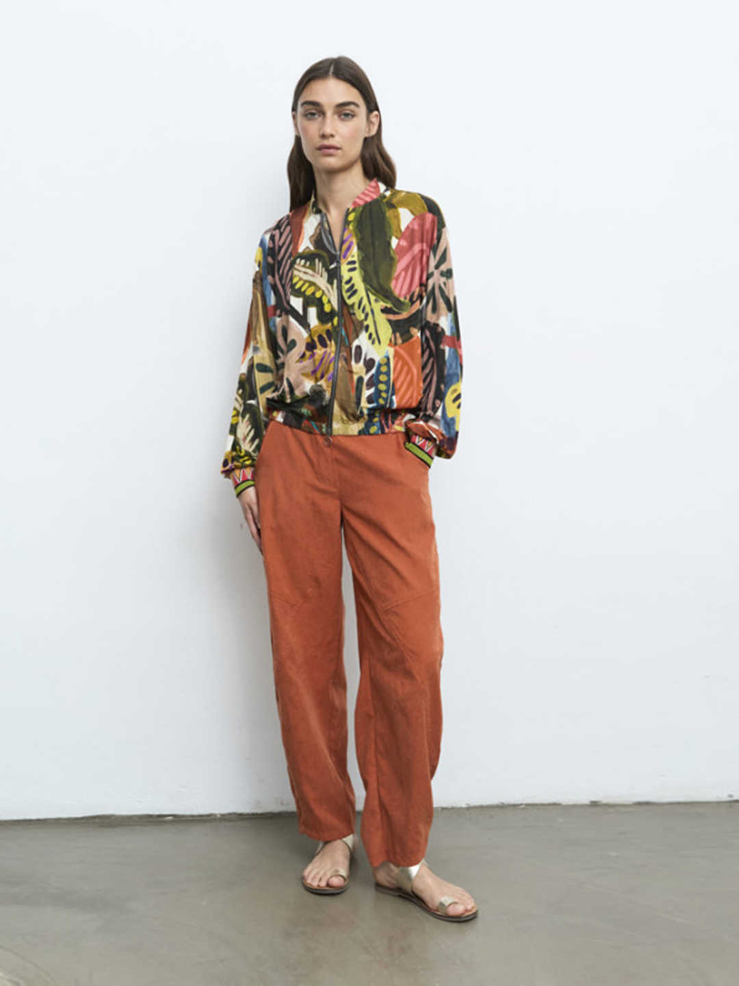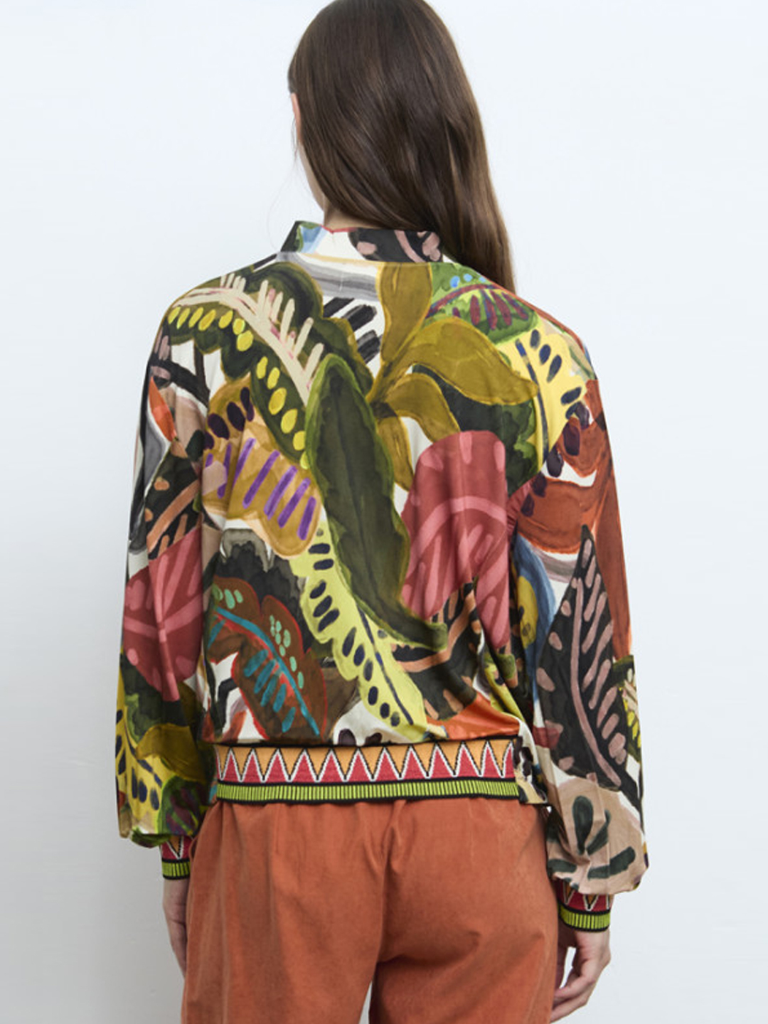 Chaqueta Frutos de Aldo Martins. Confeccionada en punto de viscosa, bomber con estampado de hojas y frutos. Cierre frontal de cremallera, cenefa elástica en colores vibrantes en los puños y bajo de de la parte trasera. Bomber con pinzas en la parte delantera del bajo para un ajuste cómodo. Una pieza perfecta para esta primavera.