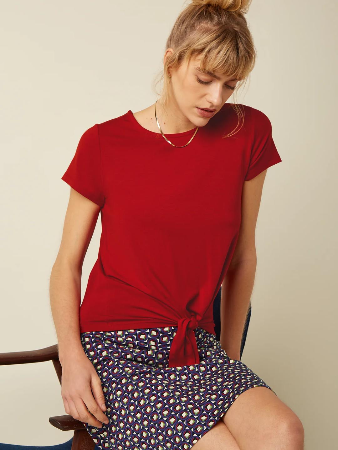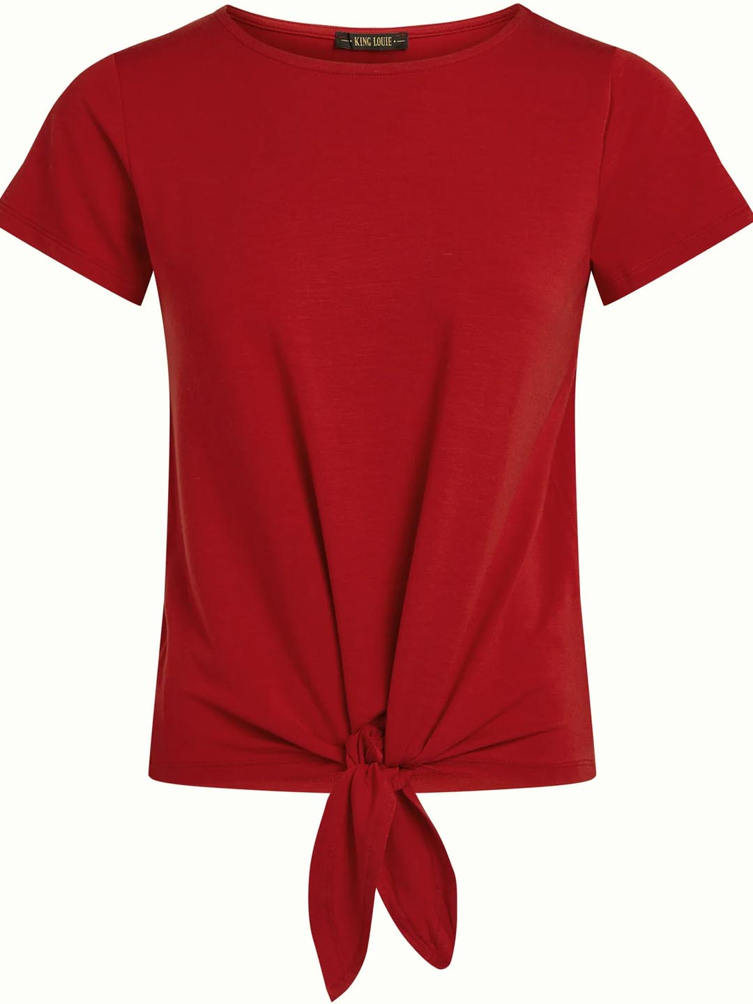 Camiseta Chili Red King Louie confeccionado con una mixtura de viscosa parcialmente hecha con circulose y tencel lyocell. Esta camiseta es una elección consciente, ya que este producto está fabricado con textiles reciclados! Camiseta con cuello redondo y mangas cortas. Ajuste regular con un nudo en la parte delantera que le otorga un look moderno para el día a día.
