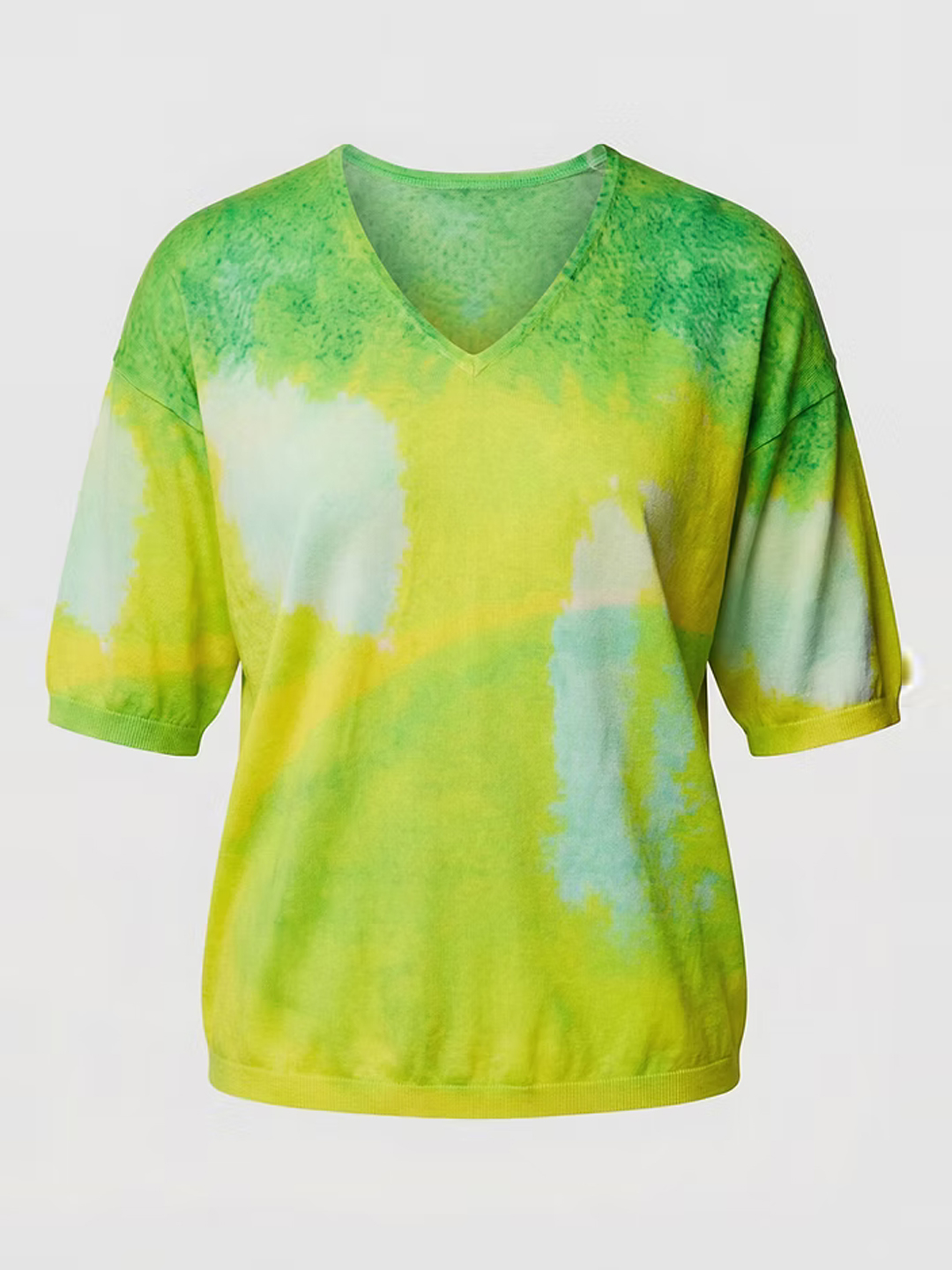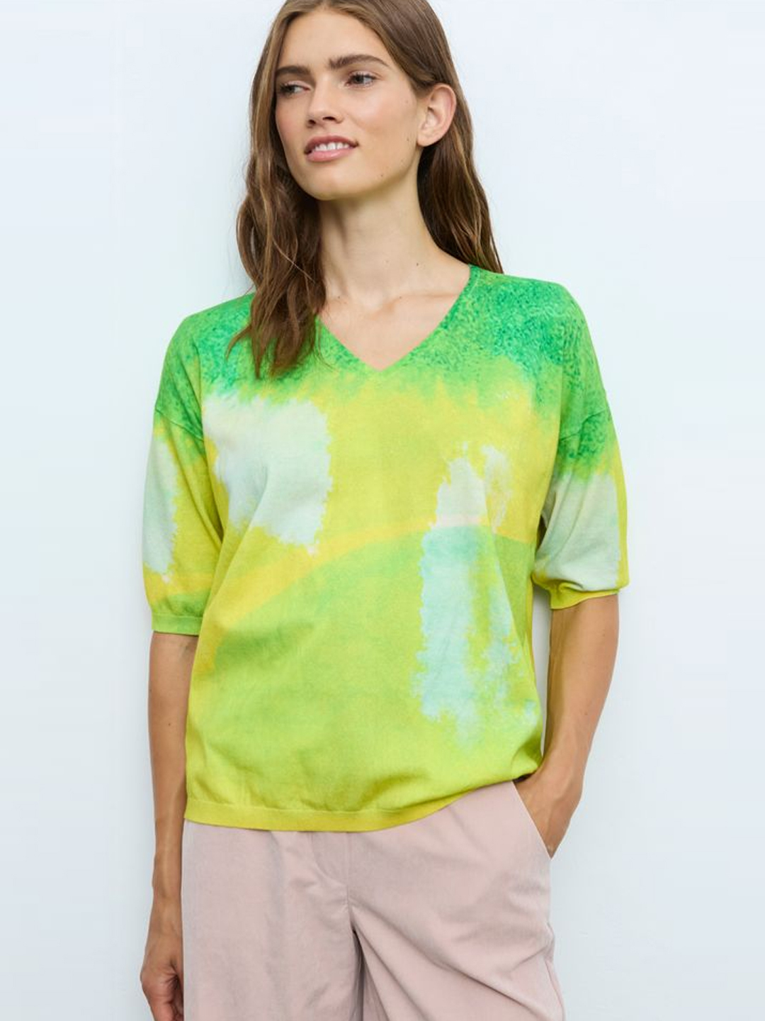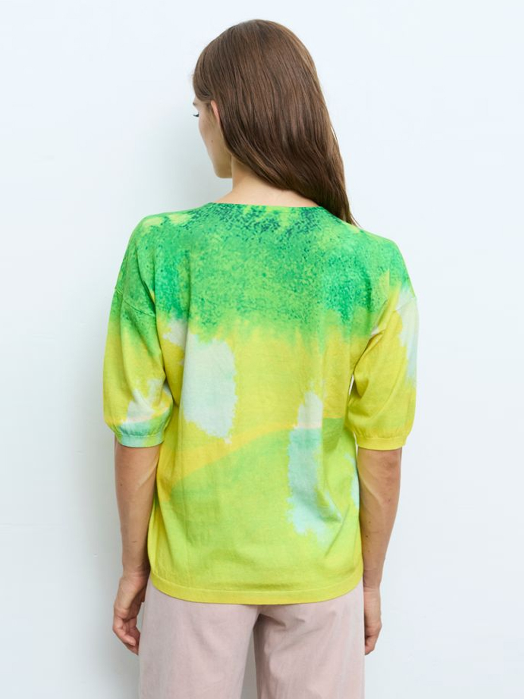 Jersey Limao de Aldo Martins. Confeccionado en una mezcla de algodón y seda, jersey de manga corta con escote en pico. El diseño destaca por su estampado efecto acuarela en tonos verdes y amarillos lima, que crea un contraste suave y muy luminoso. Una prenda perfecta para la primavera gracias su composición.