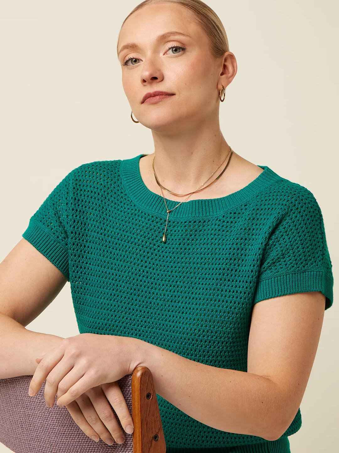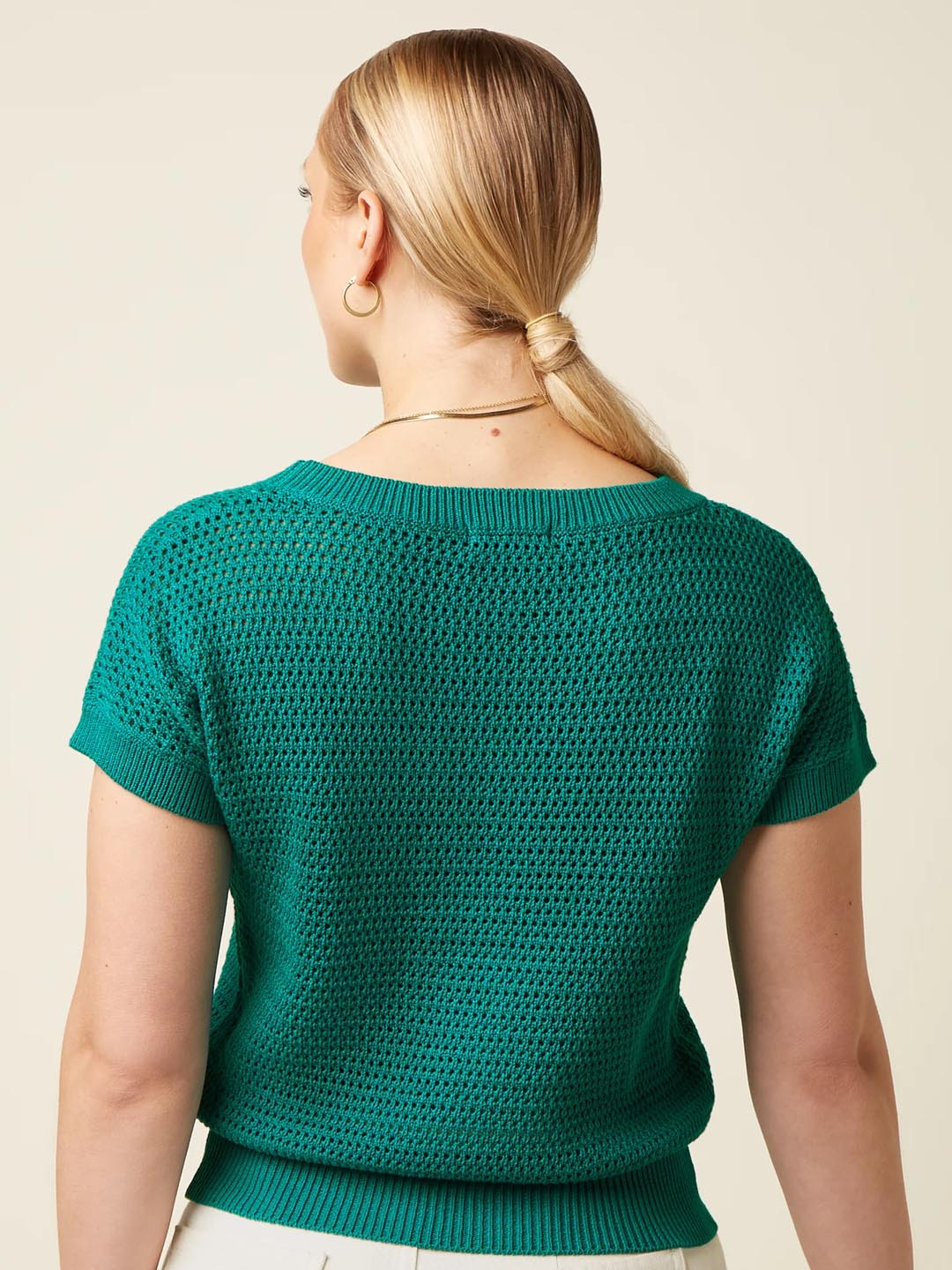 Top Soleil Ponderosa de King Louie. Confeccionado en una mezcla de algodón orgánico y acrílico. Top de manga corta con escote de barco. Este top de ajuste regular de punto calado es muy cómodo y fresco para esta temporada de primavera/ verano. Su mezcla de tejidos acerca frescura y estilo.