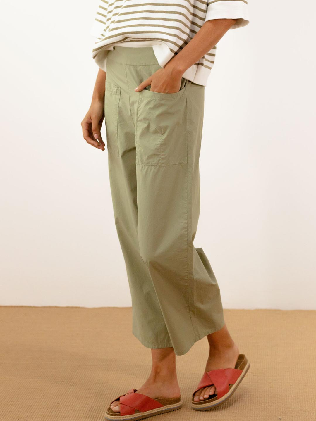 Pantalón Charm Oliva de Pan Producto Básico. Pantalón verde con petos de parche. A tea é de cor verde oliva liso e o patrón ten pernera ancha e recta, cintura elástica lisa e grandes petos de parche dianteiros. Ideal para combinar con camisetas de raias, pezas básicas de punto e sandalia plana.