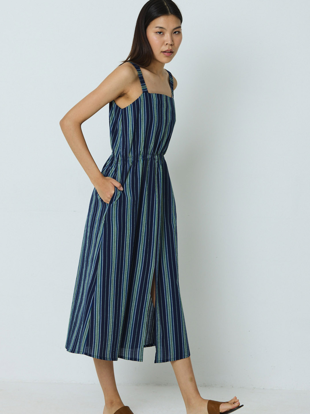 Vestido Verdaccio Blue Stripes de Mónica Lavandera. Confeccionado 100% algodón orgánico. Vestido midi de tirantes en tecido con raias azuis. Con goma na cintura, abertura na parte dianteira e petos laterais. O vestido perfecto para lucir o bronceado nos días de sol nesta primavera, verán. Vestido de Edición Limitada e Numerada.