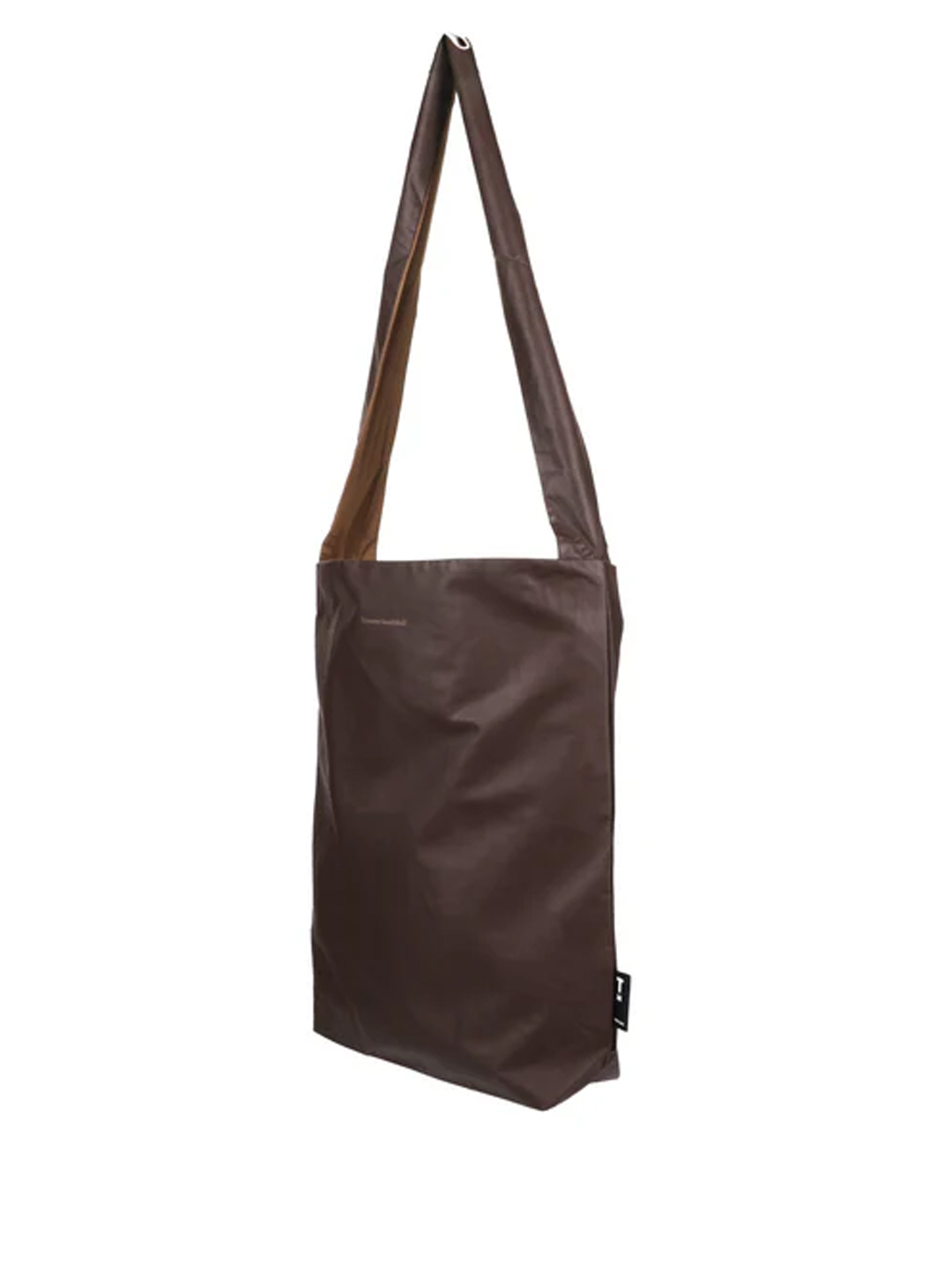 Bolso vegano impermeable e reversible de cor café/marrón de Tinne and Mía. Fabricado en pel vegana de alta calidade e interior de nailon, impermeable en ambos os casos. O bolso vén dentro dunha bolsa con peche de cremallera. O bolso leva impreso en contraste "BRUNETTE BOMBSHELL"