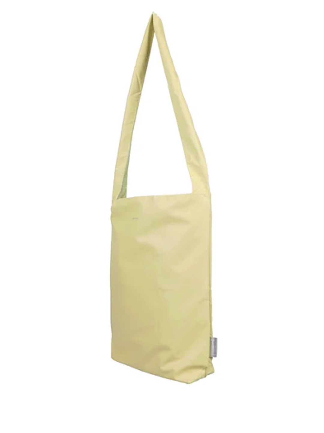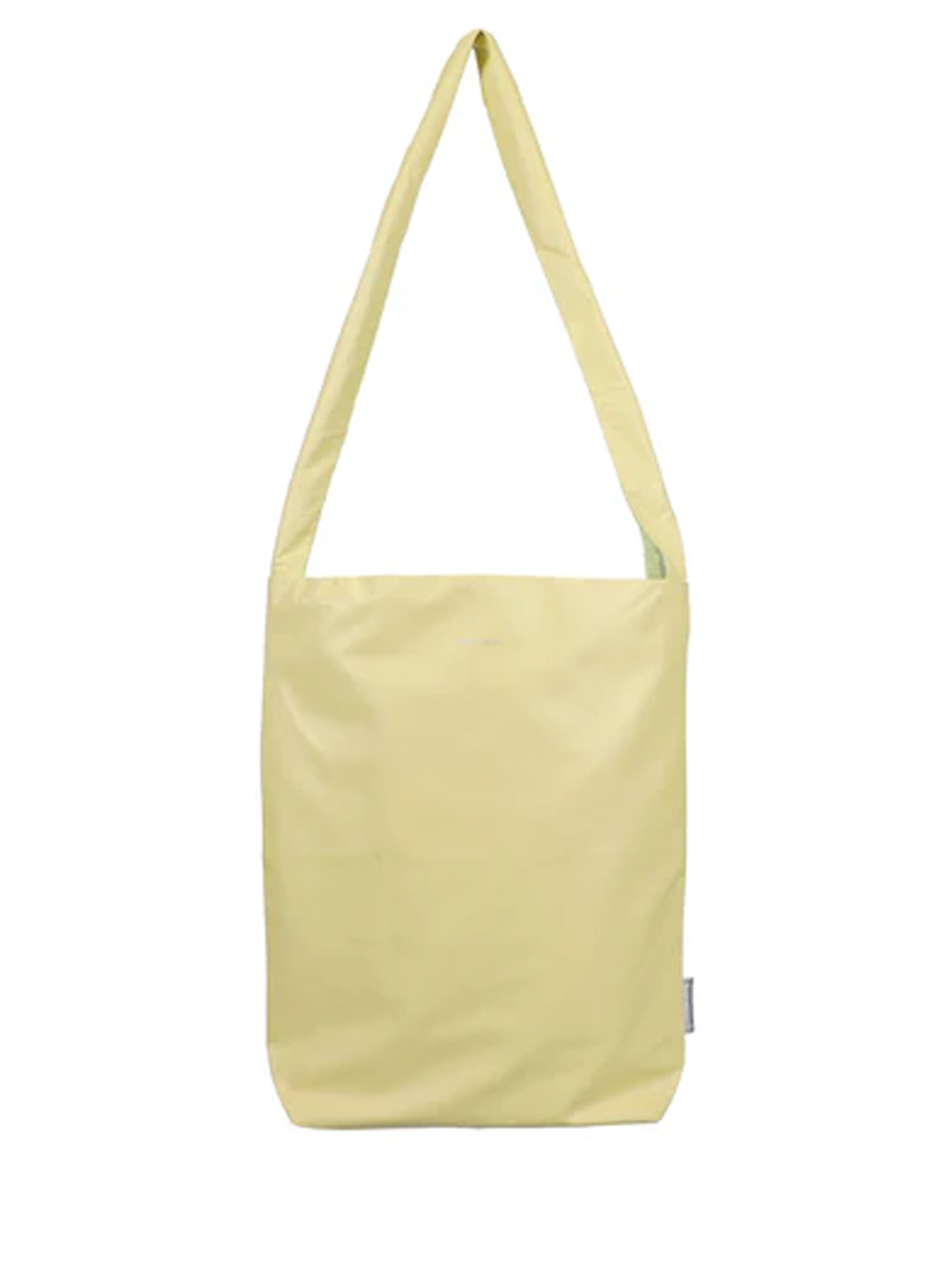 Bolso vegano impermeable e reversible de cor amarelo/amarelo cadros de Tinne and Mía. Fabricado en pel vegana de alta calidade e interior de nailon, impermeable en ambos os casos. O bolso vén dentro dunha bolsa con peche de cremallera. O bolso leva impreso en contraste "OH ME, HO MY"