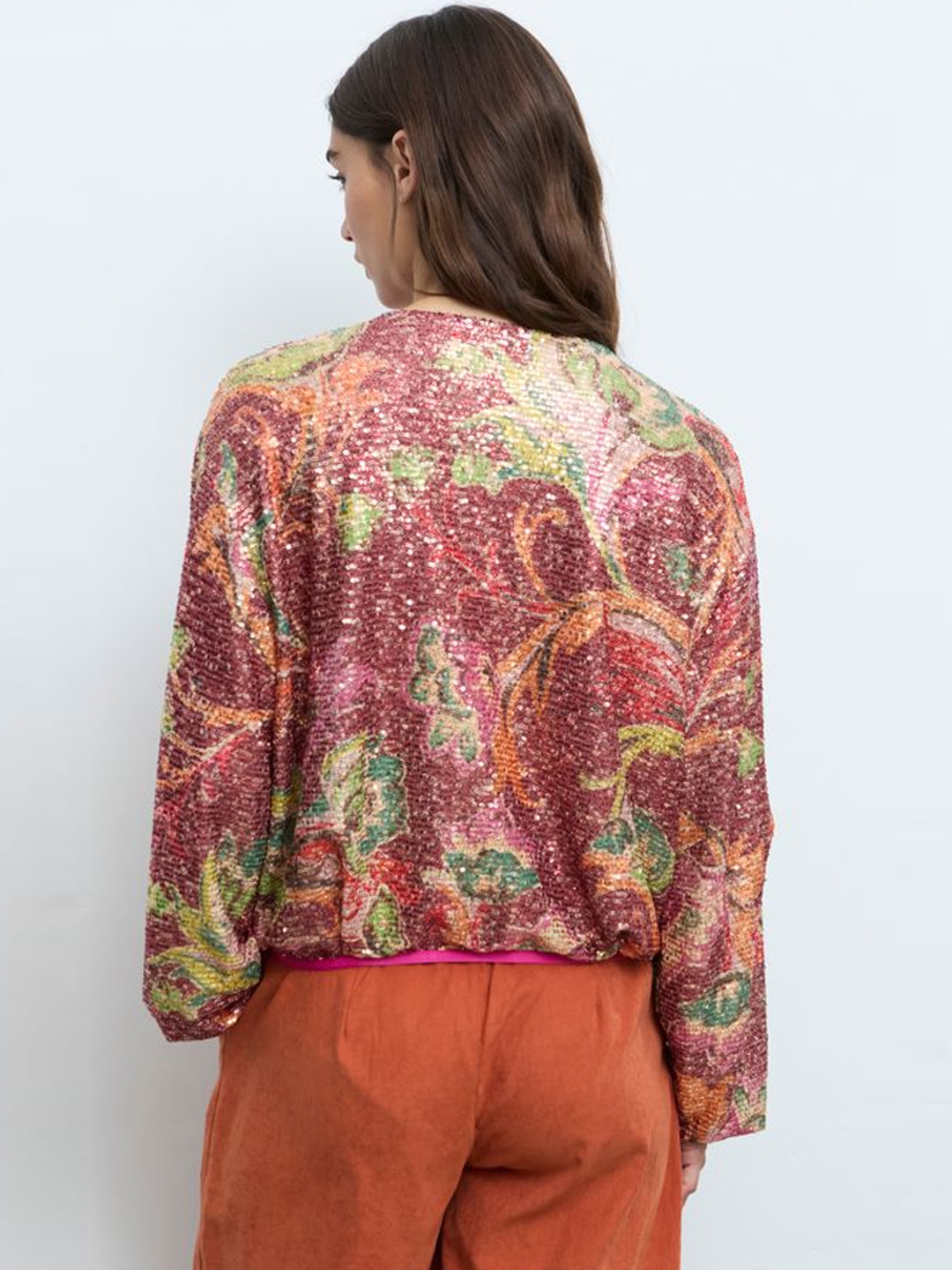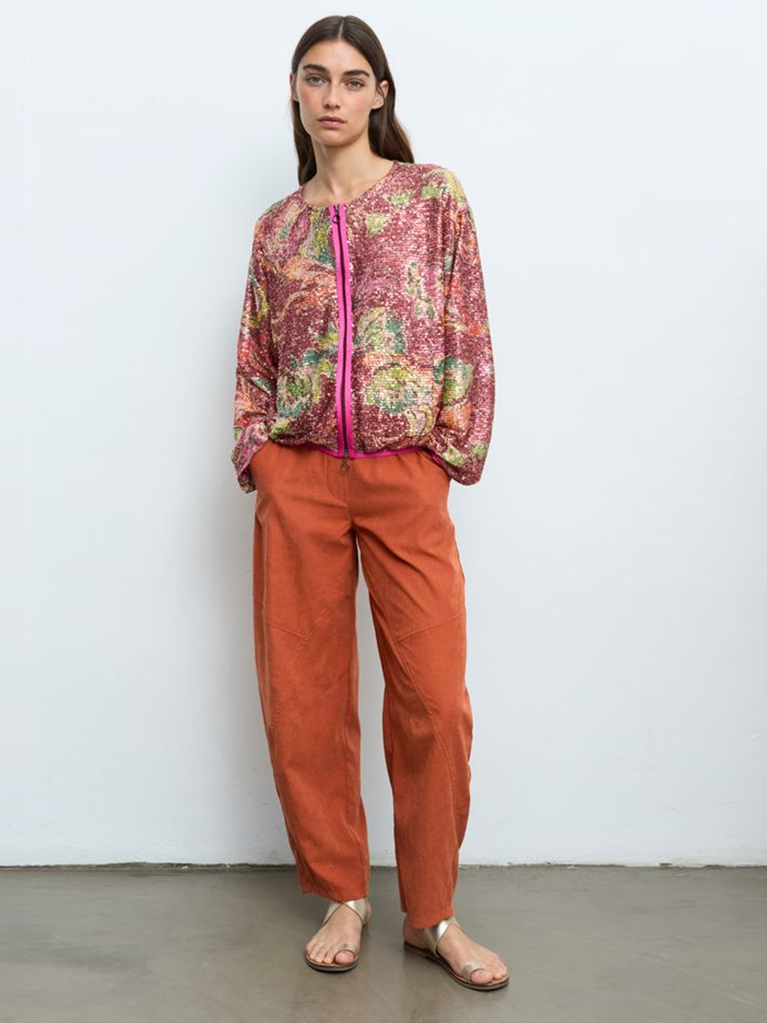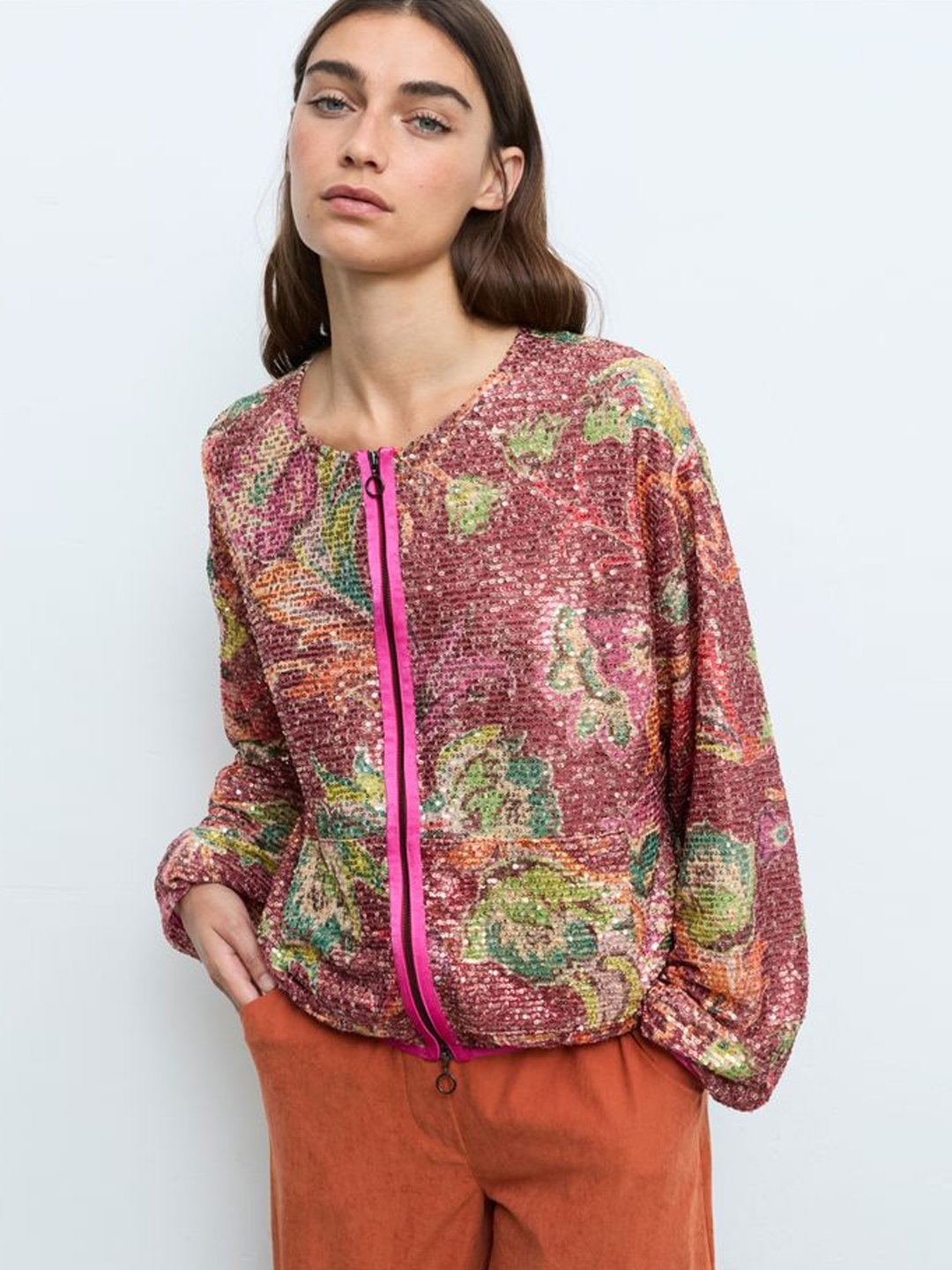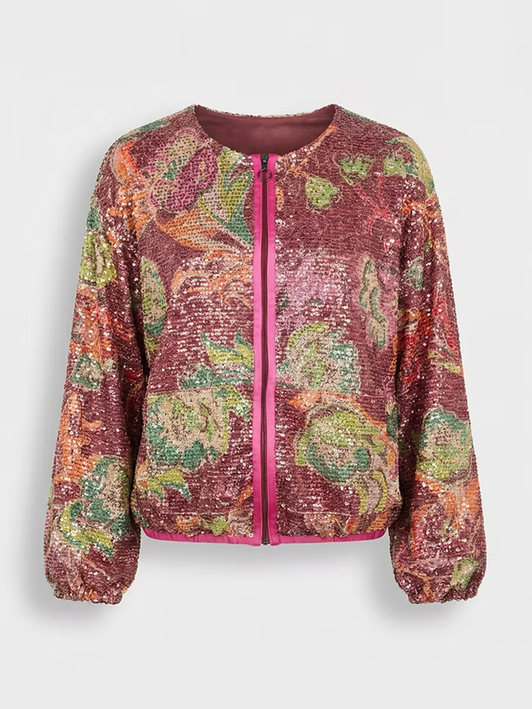 Bomber Lanai de Aldo Martins. Confeccionada en PES, chaqueta de abelorios con estampado floral multicolor sobre base en ton rosado. Presenta pescozo redondo e peche frontal con cremallera de dobre carro en contraste. O deseño incorpora petos laterais e mangas longas con acabado elástico que favorecen un axuste cómodo. Unha peza rechamante e versátil, ideal para elevar calquera look.