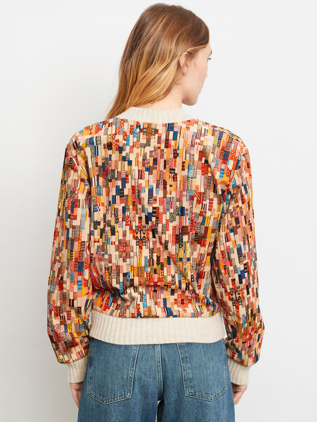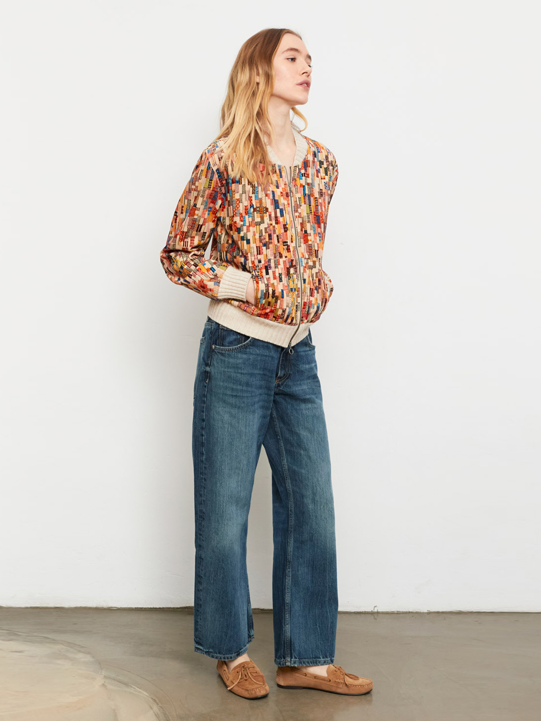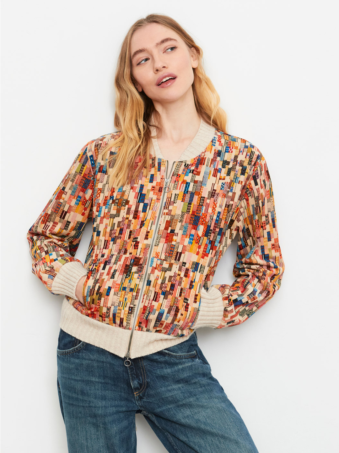 Bomber Luna de Aldo Martins. Confeccionada en algodón, chaqueta tipo bomber de micropana nunha luminosa combinación de diversas cores. Destaca o suave acabado tipo canalé en pescozo, puños e baixo.De manga longa e petos laterais.