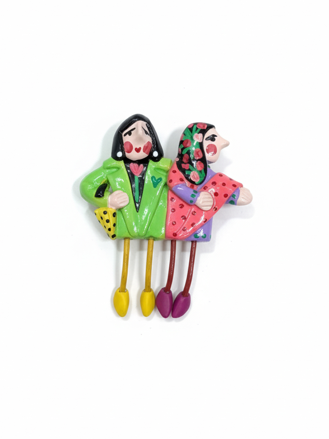 Broche As Marías verde, lila e rosade Ana Miguéns. Peza única realizada e pintada a man. Broche de arcilla polimérica de 7cm x 6 cm.