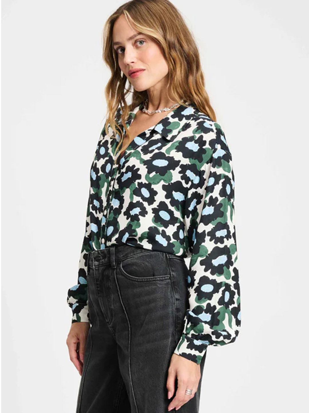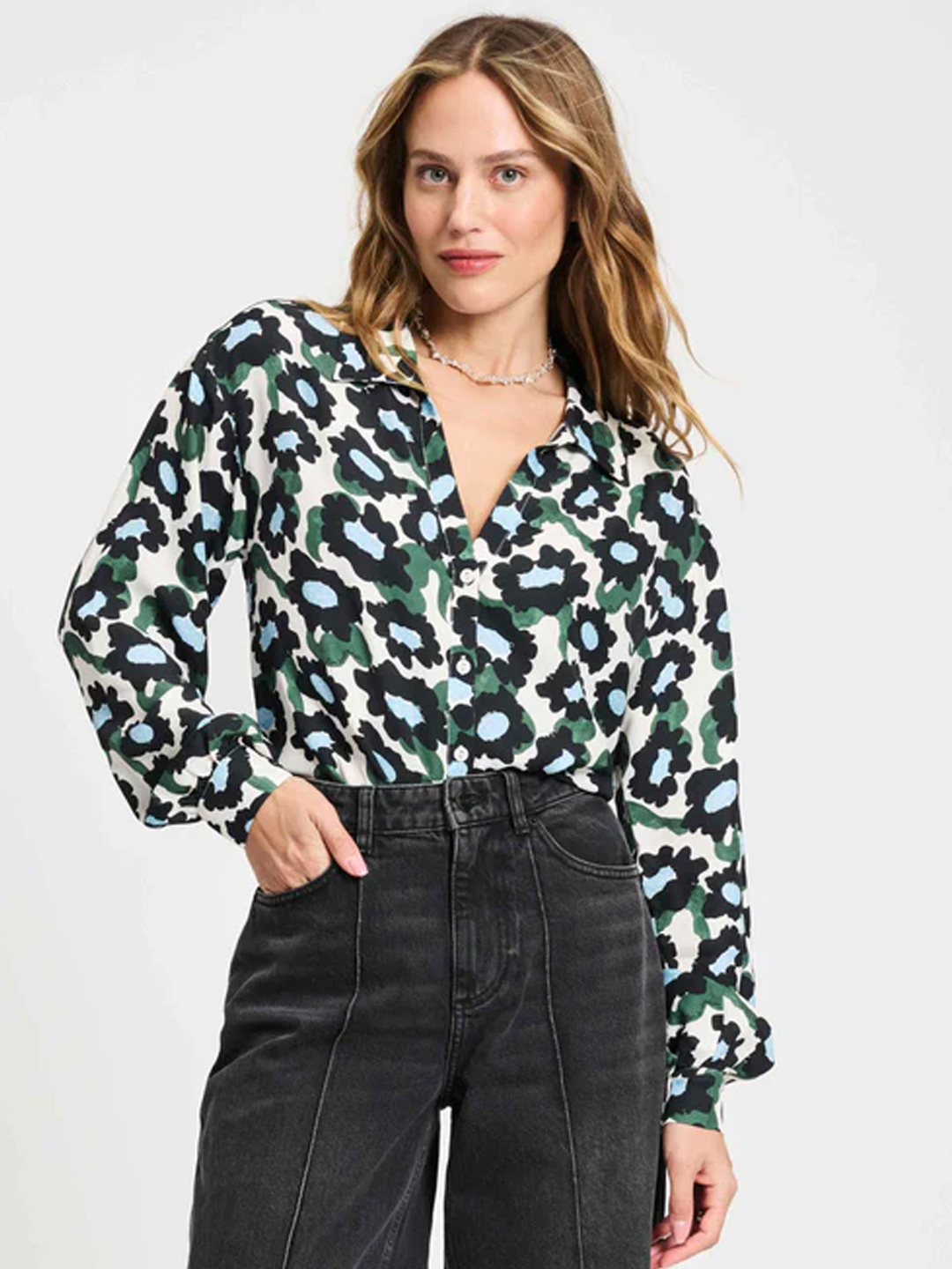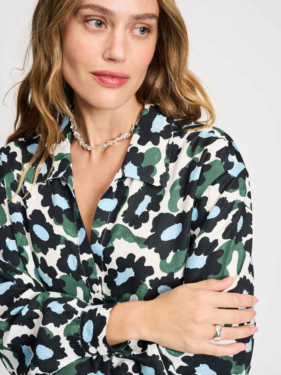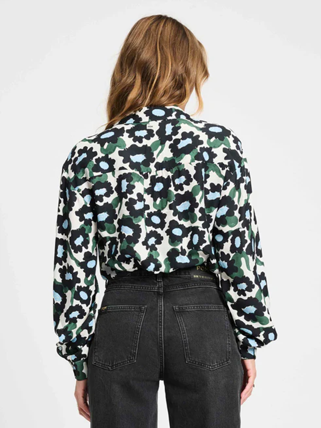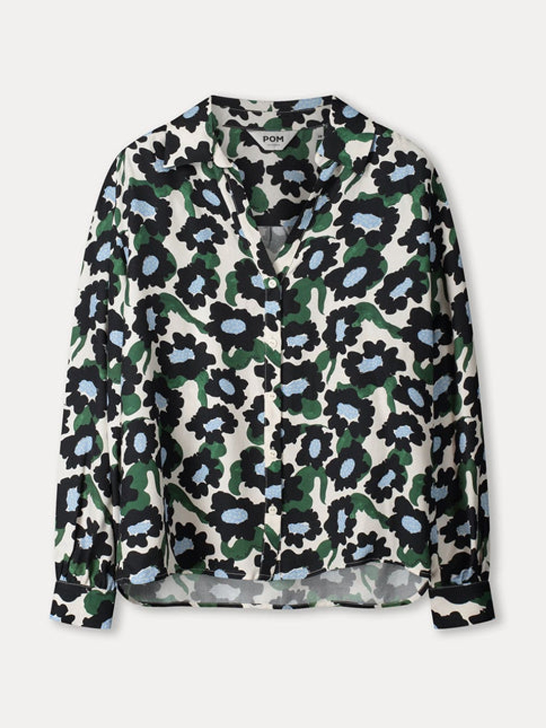 Camisa Wild Flowers Ecru de Pom Amsterdam. Estampados florais rechamantes, listos para lucirse. Os tonos azuis gráficos deste estampado realzan o teu look ao instante, mentres que o corte recto con tecido de satén crea unha silueta relaxada. Esta preciosa camisa e o teu aliado perfecto para este outono e inverno. A camisa ten un corte clásico recto con mangas longas con puños. Leva pescozo clásico e tapeta con botóns ocultos. Definitivamente a prenda que non pode faltar no armario este inverno.