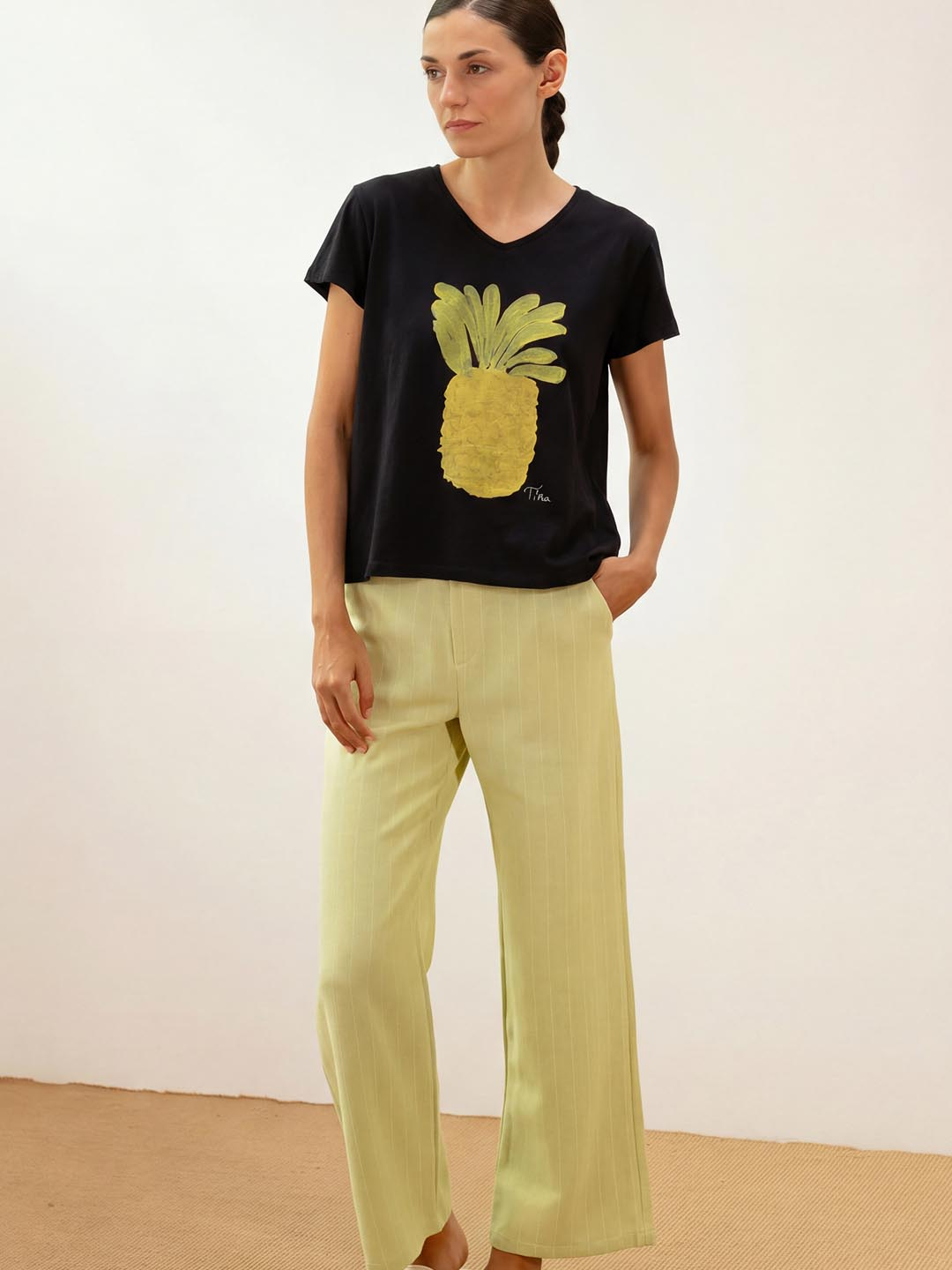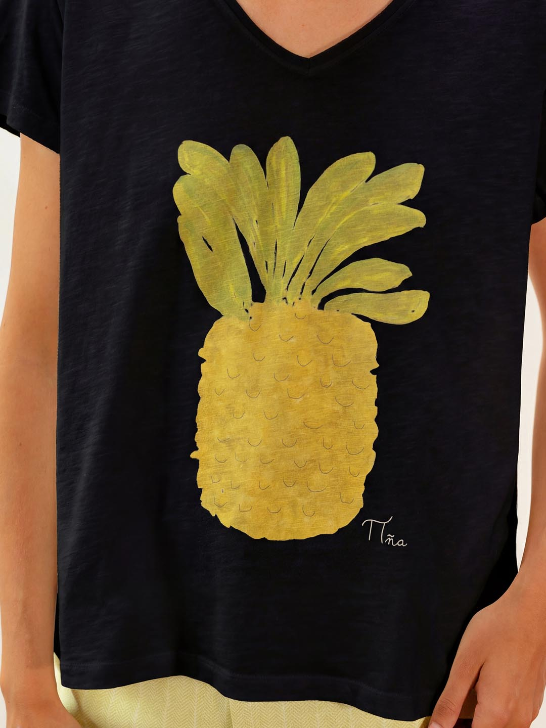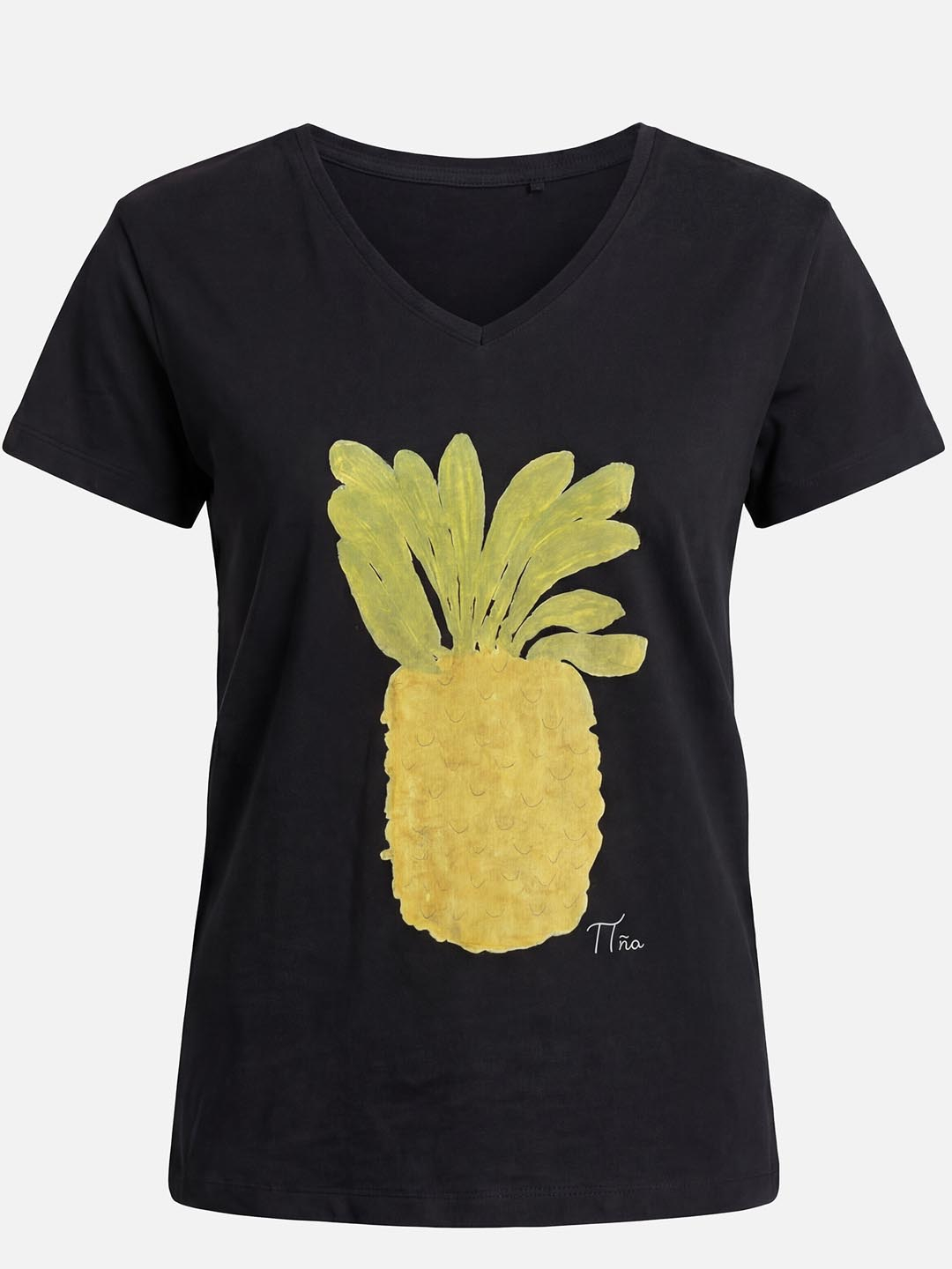 Camiseta Piña de Pan Producto Básico. Camiseta negra de algodón orgánico con estampado Piña. Ten un patrón amplo con movemento, manga curta de estética casual e escote de pescozo de pico. Perfecta para levar con pantalóns crus, vaqueiros ou saias en tons mostaza para resaltar o debuxo.