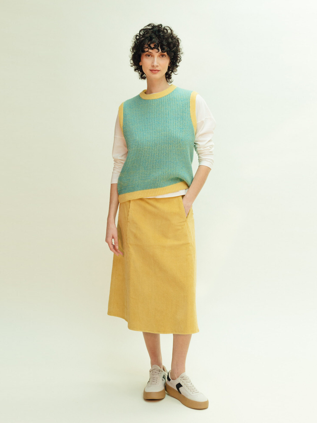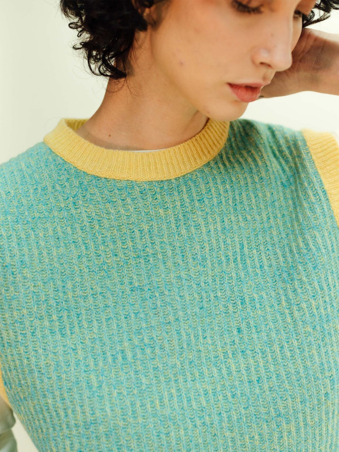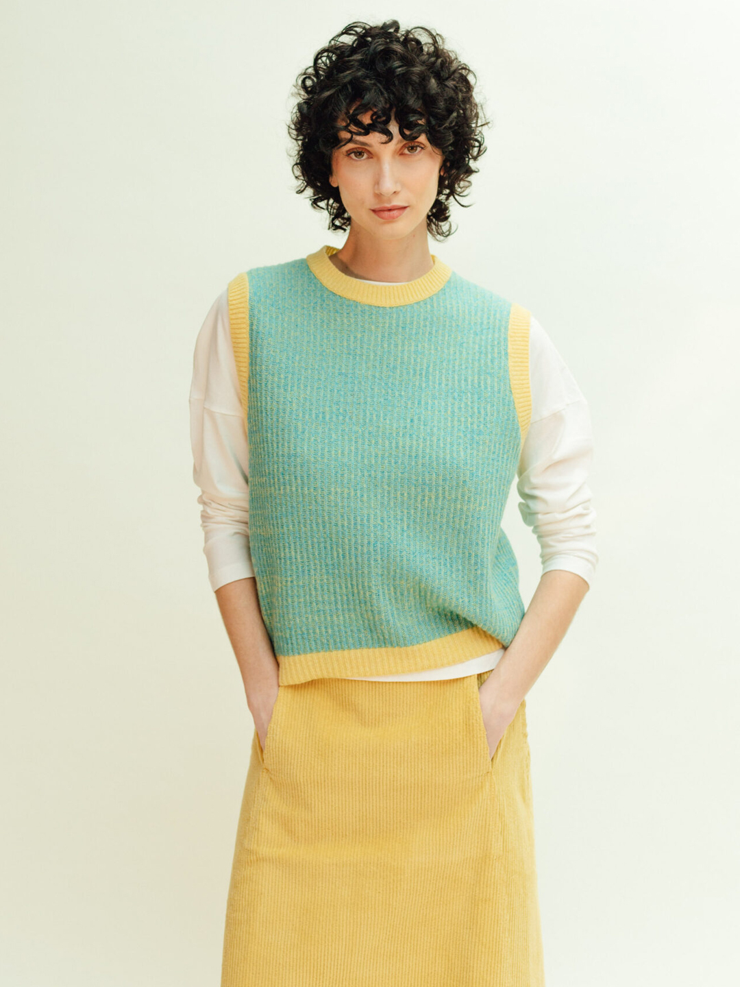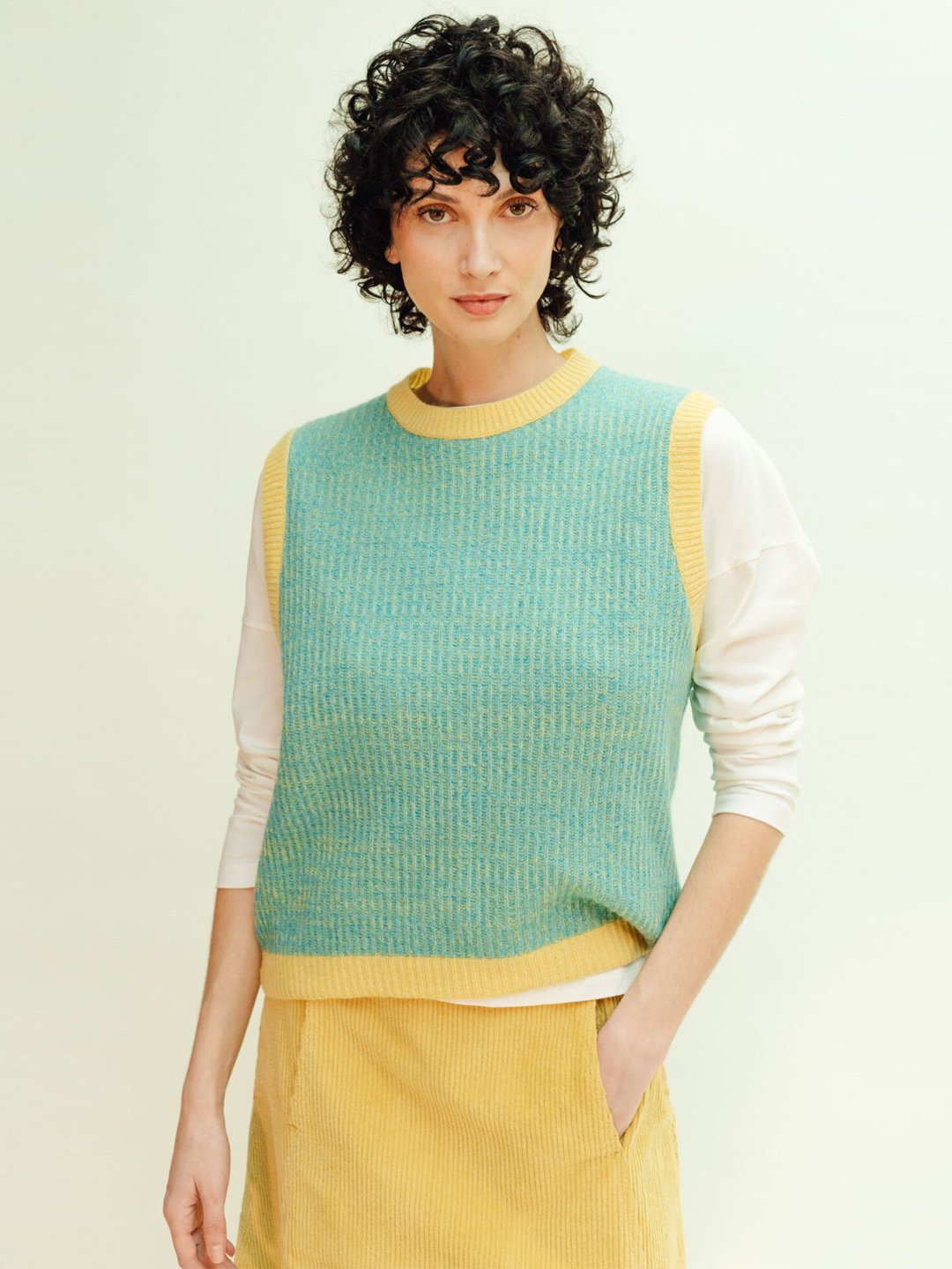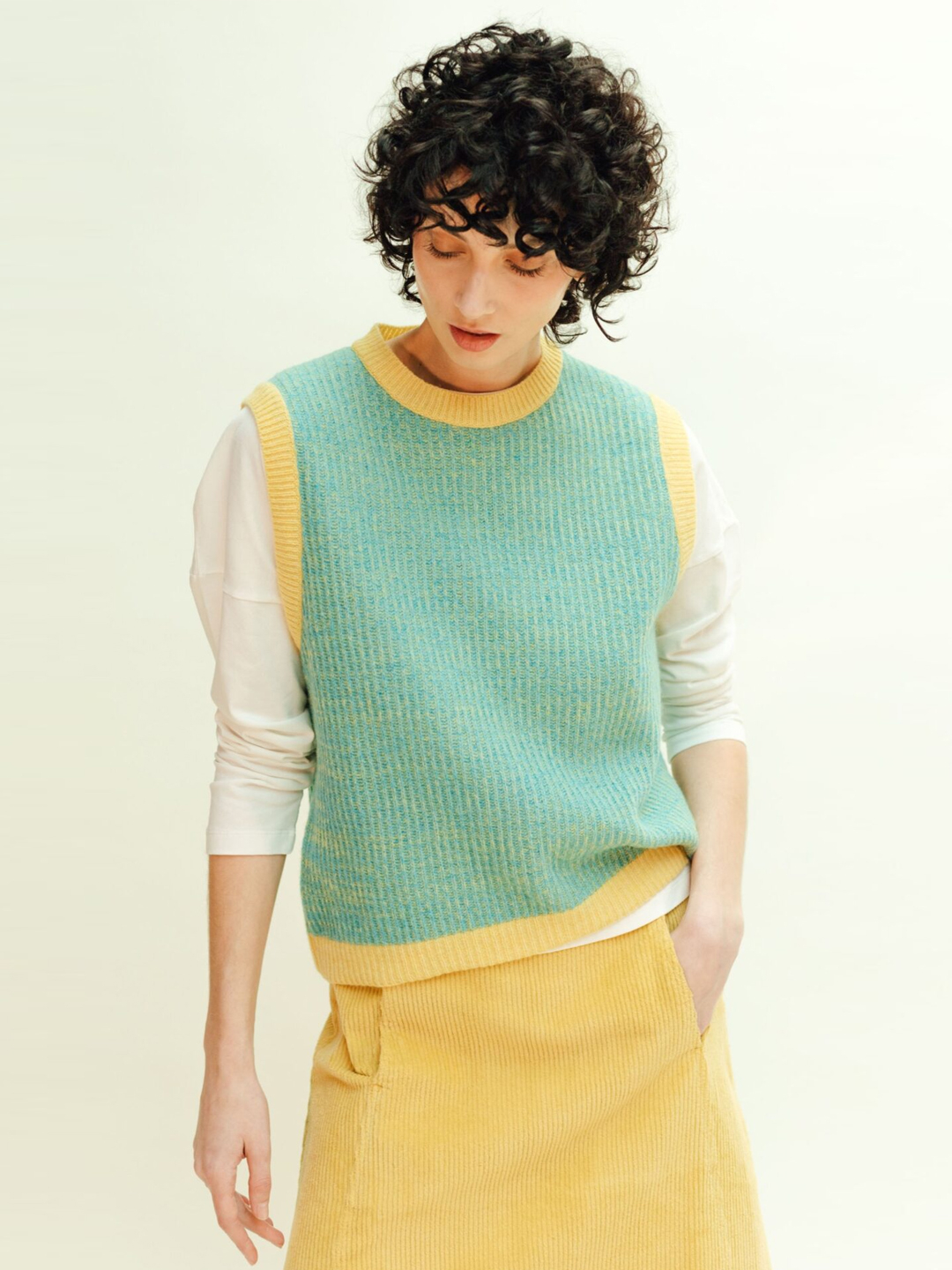 Chaleco Acento de Pan Producto Básico. Confeccionado en la, chaleco de punto sen mangas cunha divertida mestura de cores. De cor verde azulado, mentres que as sisas, pescozo e bordo inferior son en amarelo con acabado acanalado.