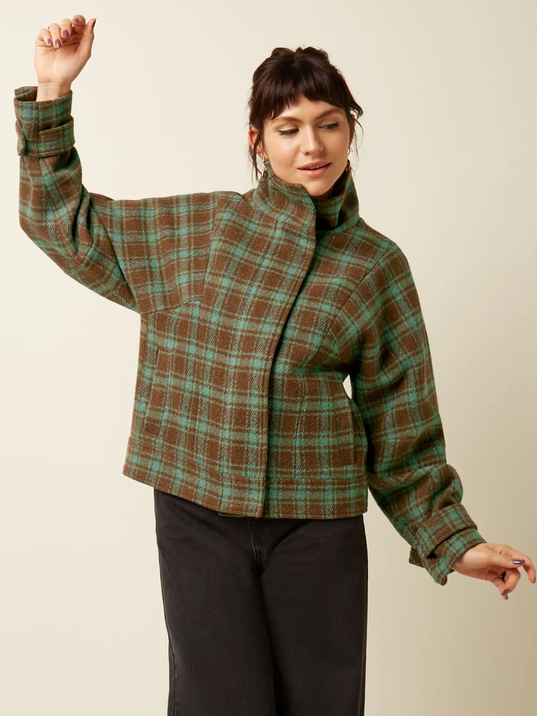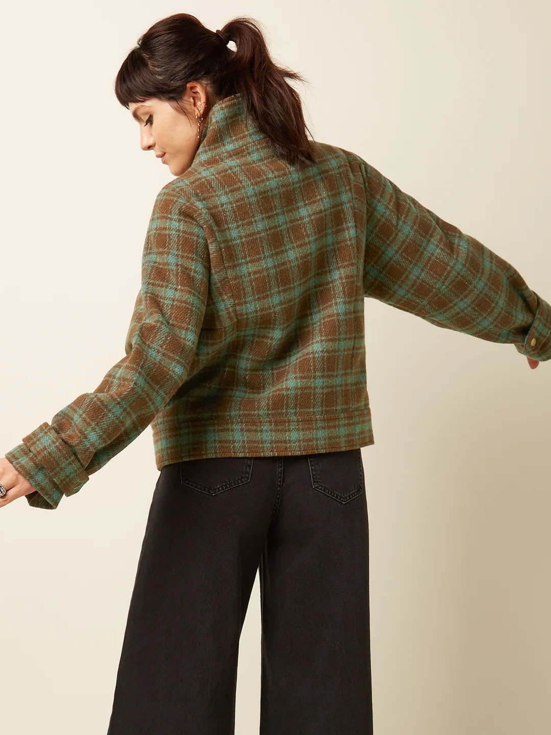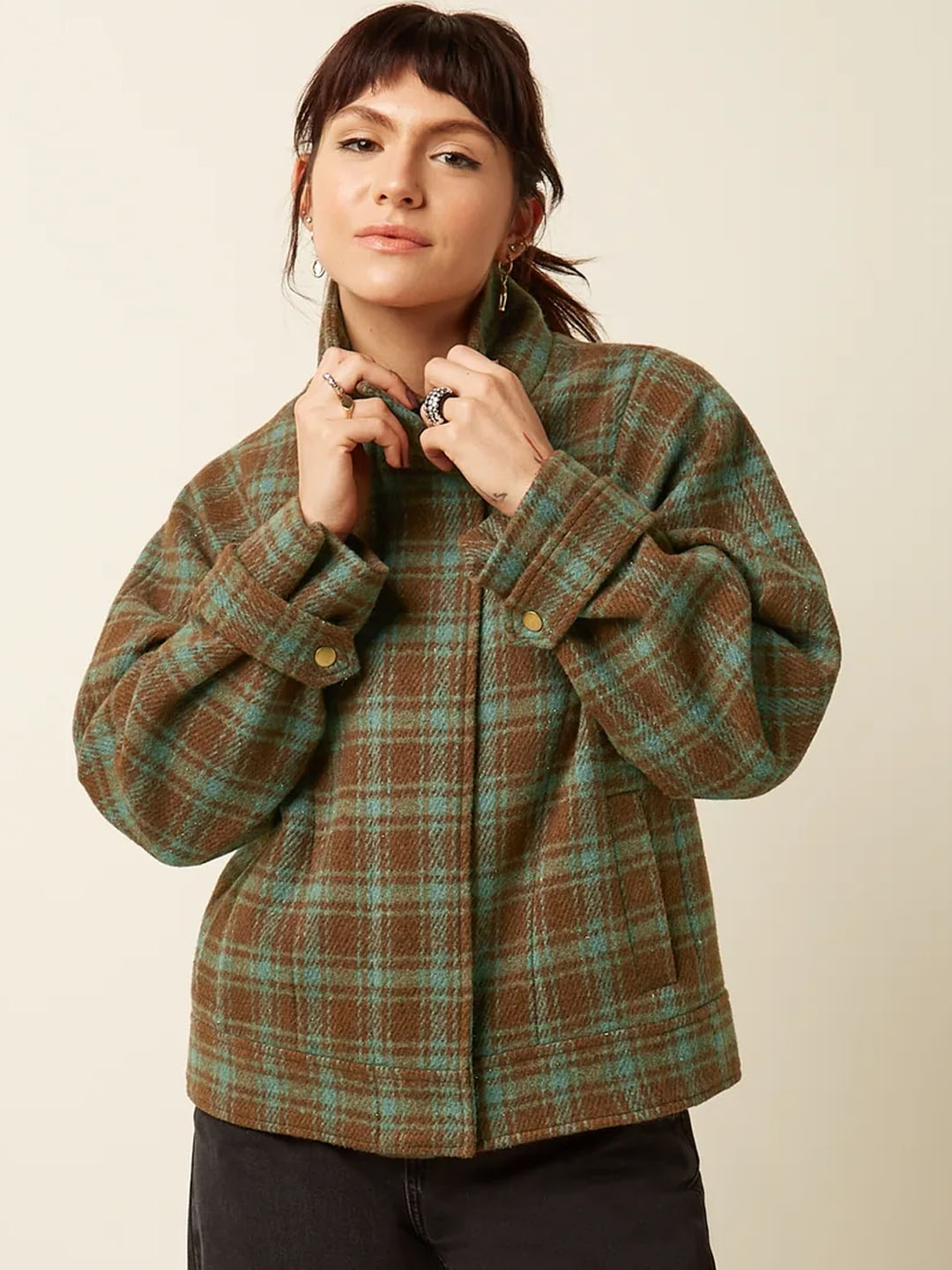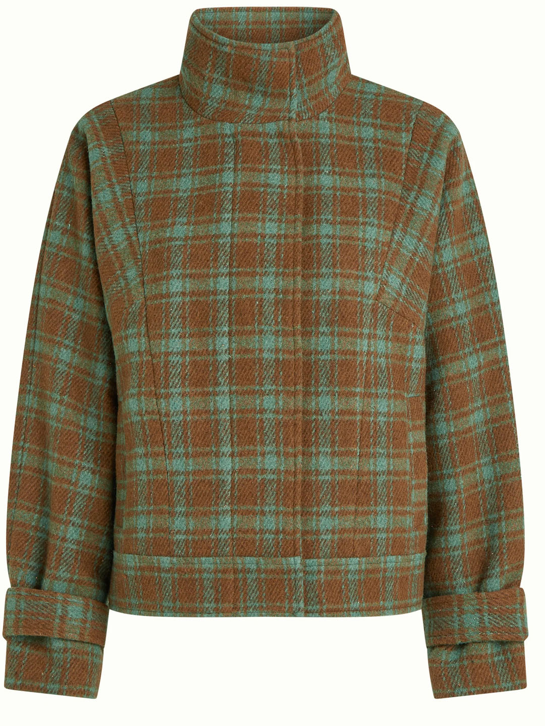 Chaqueta Varna Coppa Check de King Louie confeccionada 100% poliéster. É unha chaqueta lixeiramente folgada cun pescozo alto e mangas longas. Ten detalles de costura e unhas elegantes solapas nos puños. O peche é de cremallera con botóns a presión. É unha chaqueta que estiliza e cómoda de levar nesta tempada de outono e inverno.