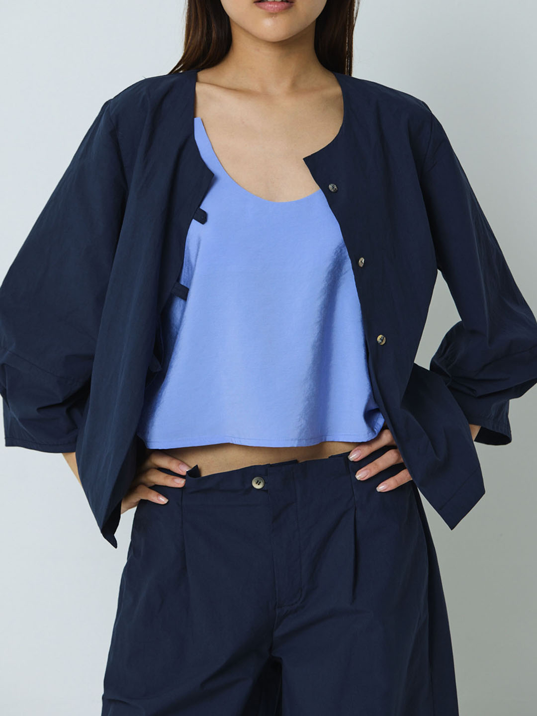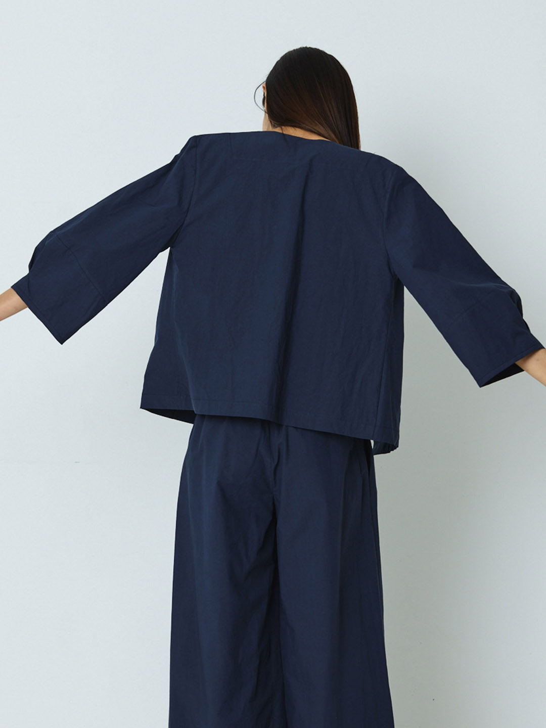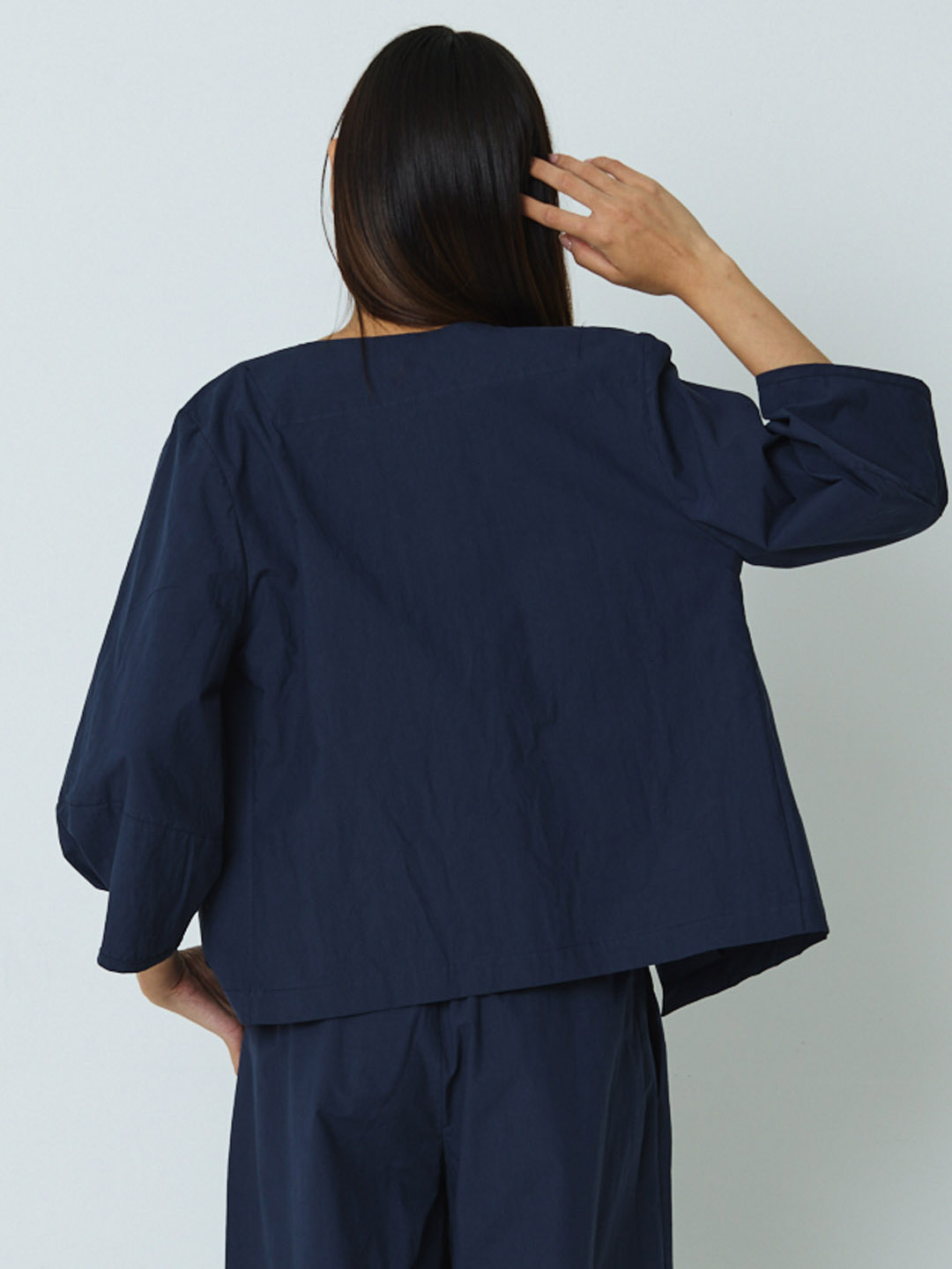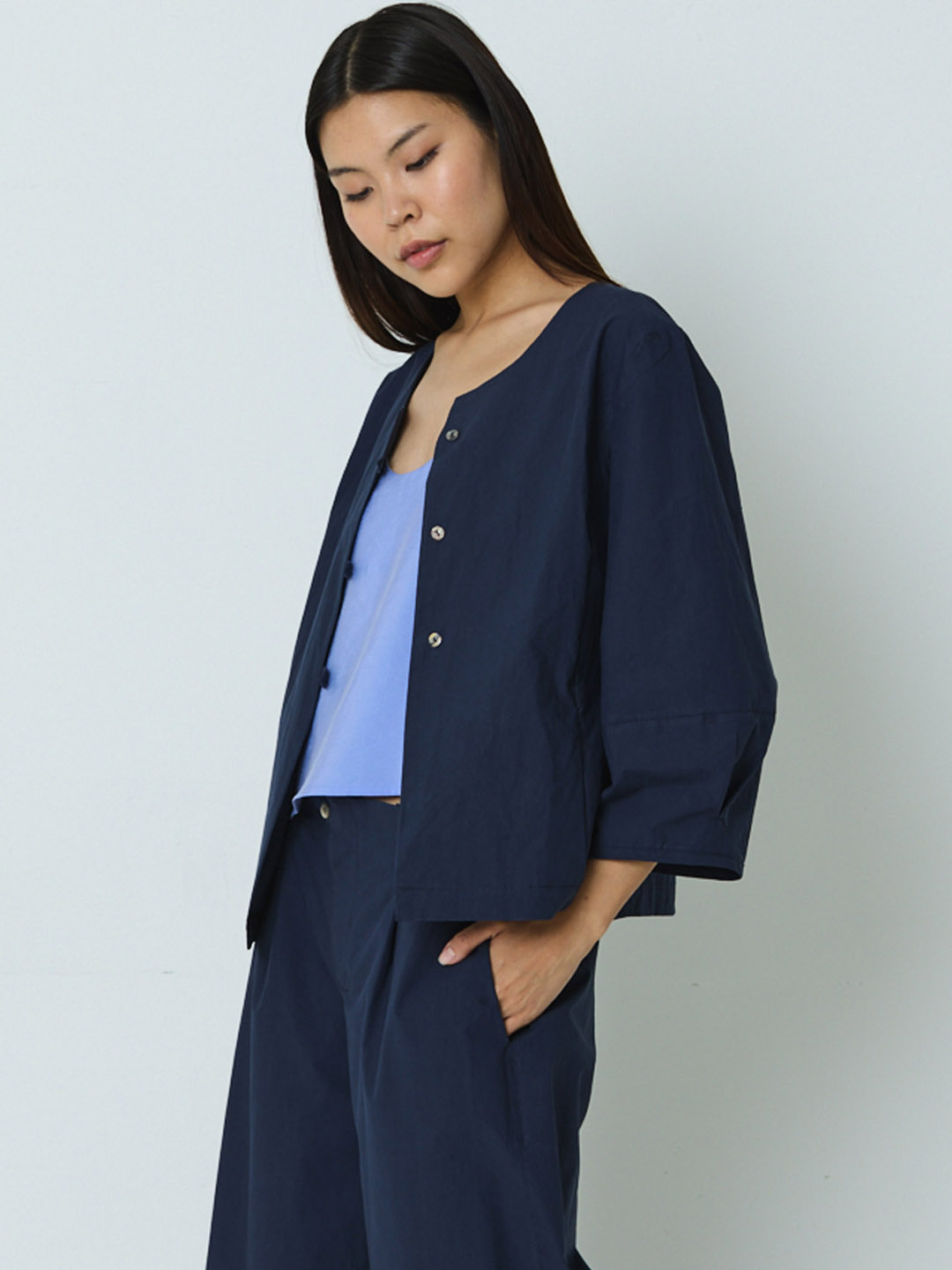 Chaqueta Chamois Blue-collar de Mónica Lavandera, confeccionada en 100% algodón orgánico. Esta chaqueta en cor azul leva peche de botóns. Ten as mangas abullondadas cun pliege no puño e petos laterais. Chaqueta de Edición Limitada e Numerada.