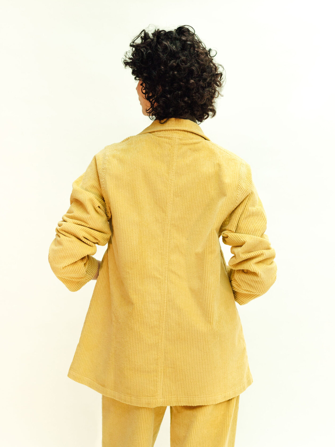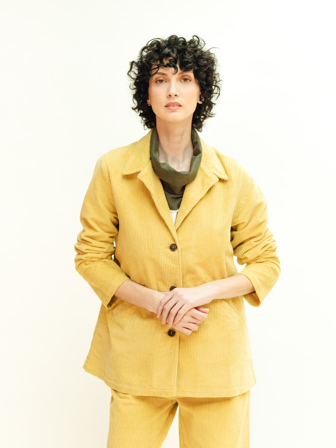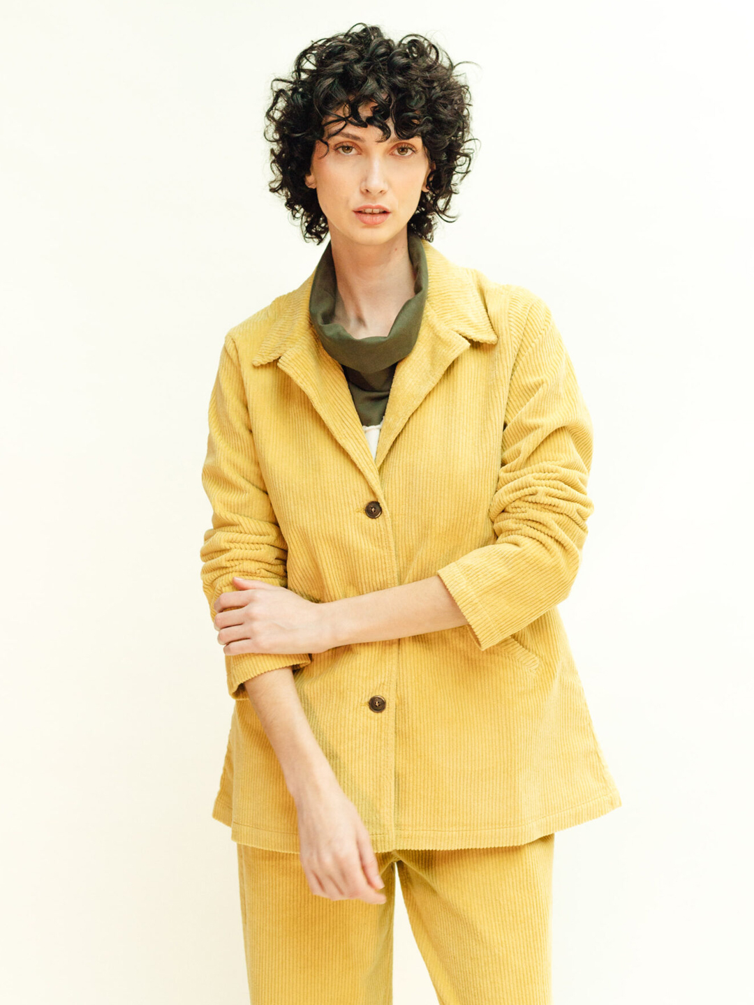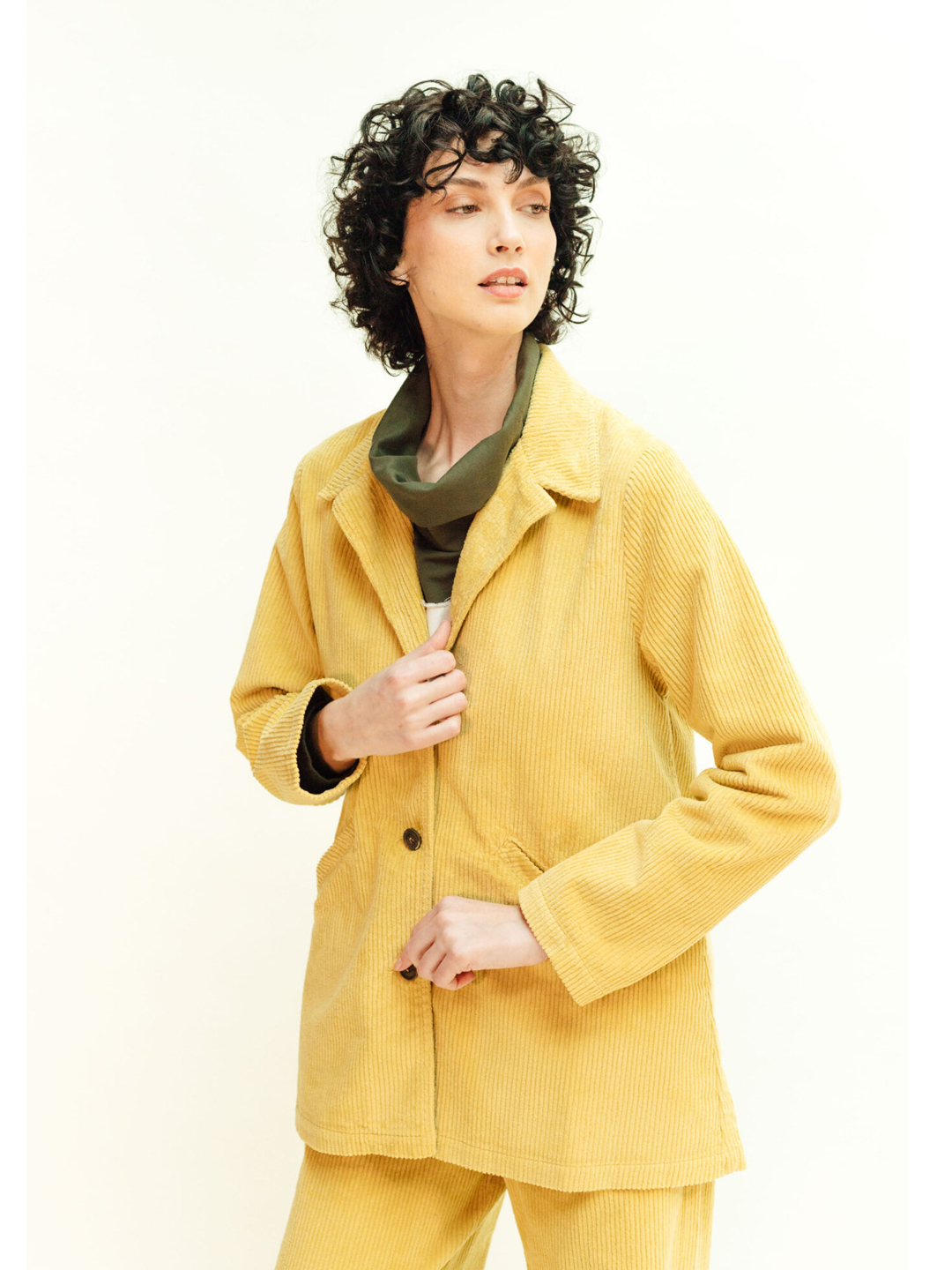 Chaqueta Ritmo de Pan Producto Básico. Confeccionada en algodón, chaqueta de pana de cor mostaza con corte lixeiramente evasé, pescozo con lapelas, petos en diagonal e peche frontal con botóns