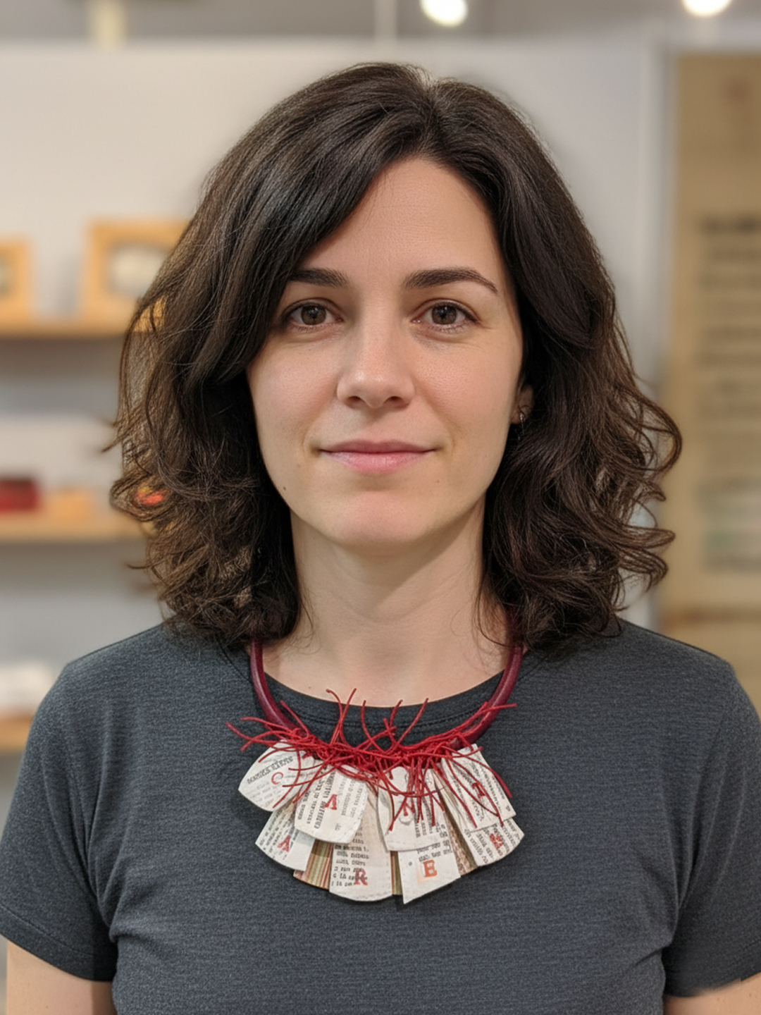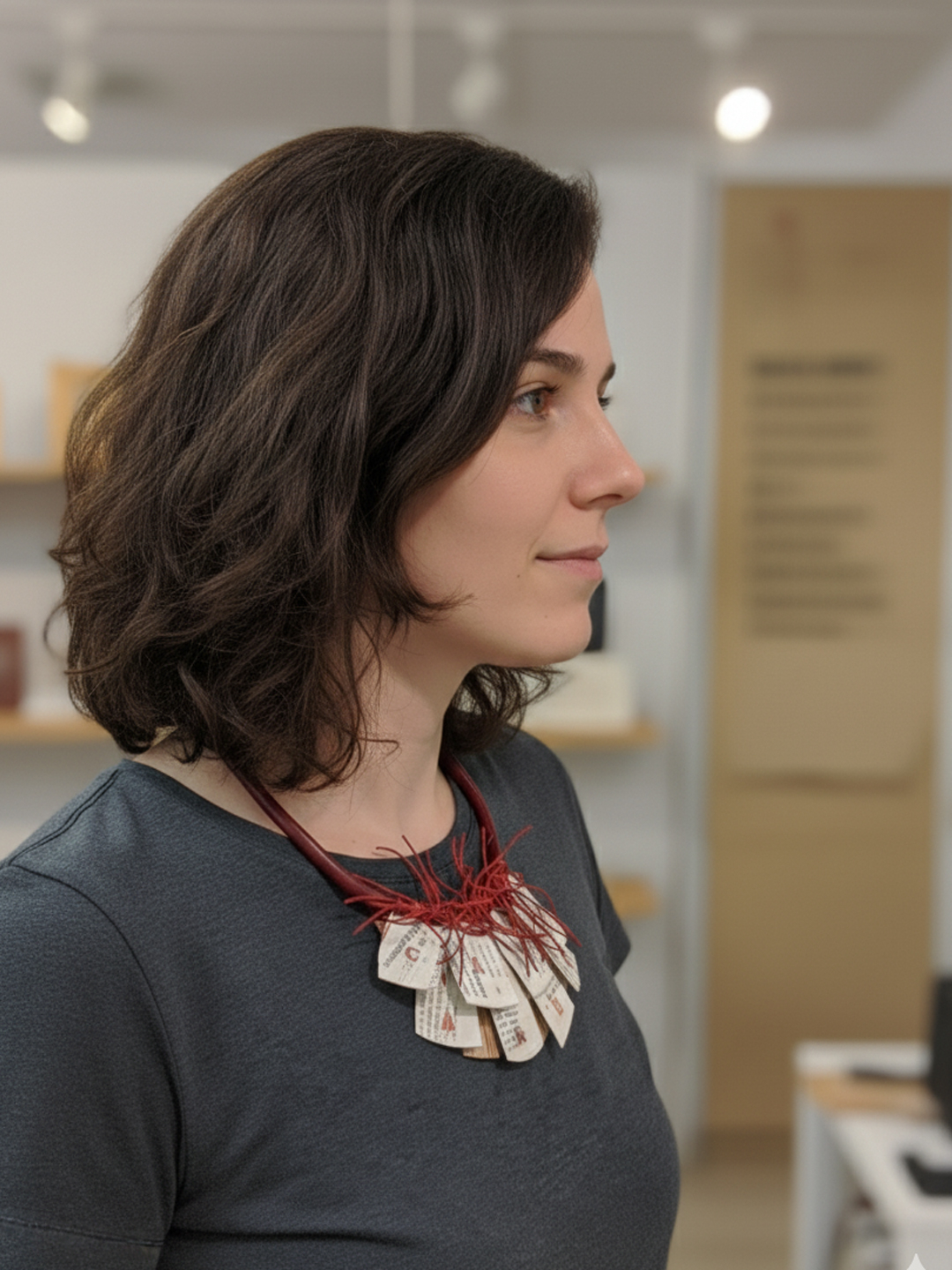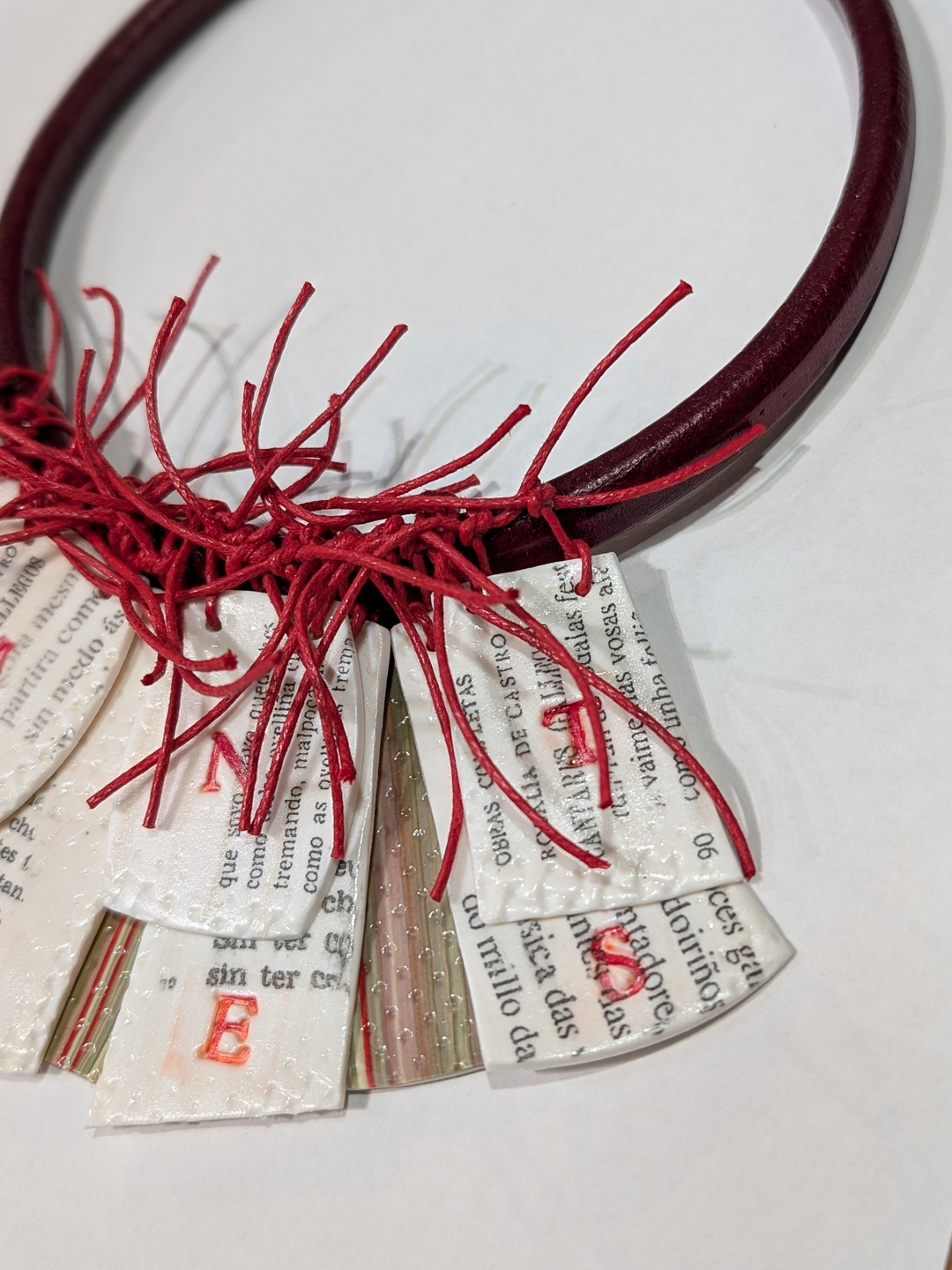 Colar Cantares Gallegos de Ana Migúens. Inspirado na obra de Rosalía de Castro, considerada como unha das obras fundamentais da literatura galega de todos os tempos. Realizado de maneira artesanal con arxila polimérica, coiro e tecido téxtil. O colar ten unha cadea de eslabóns en dourado, para acadar o longo desexado.