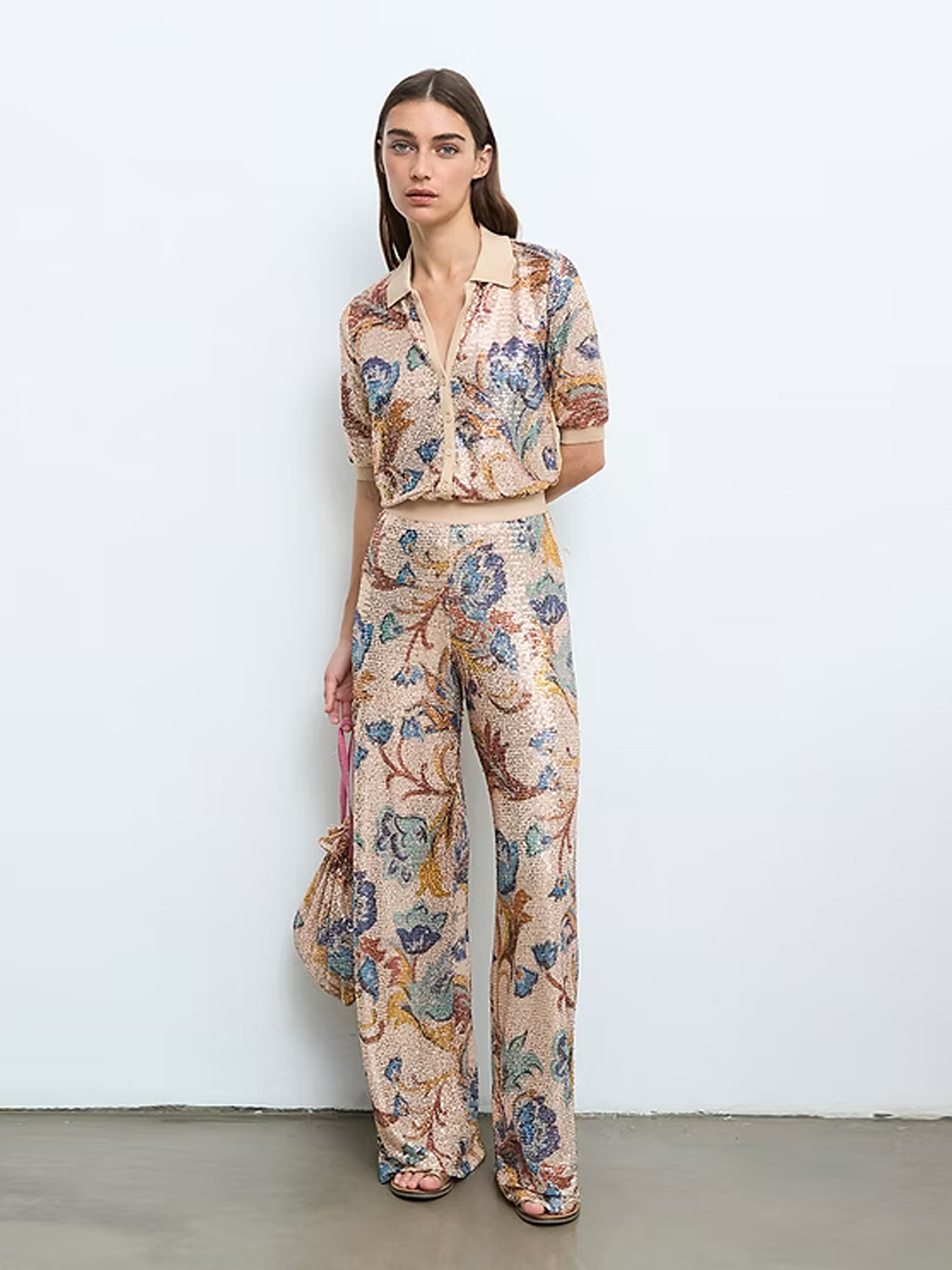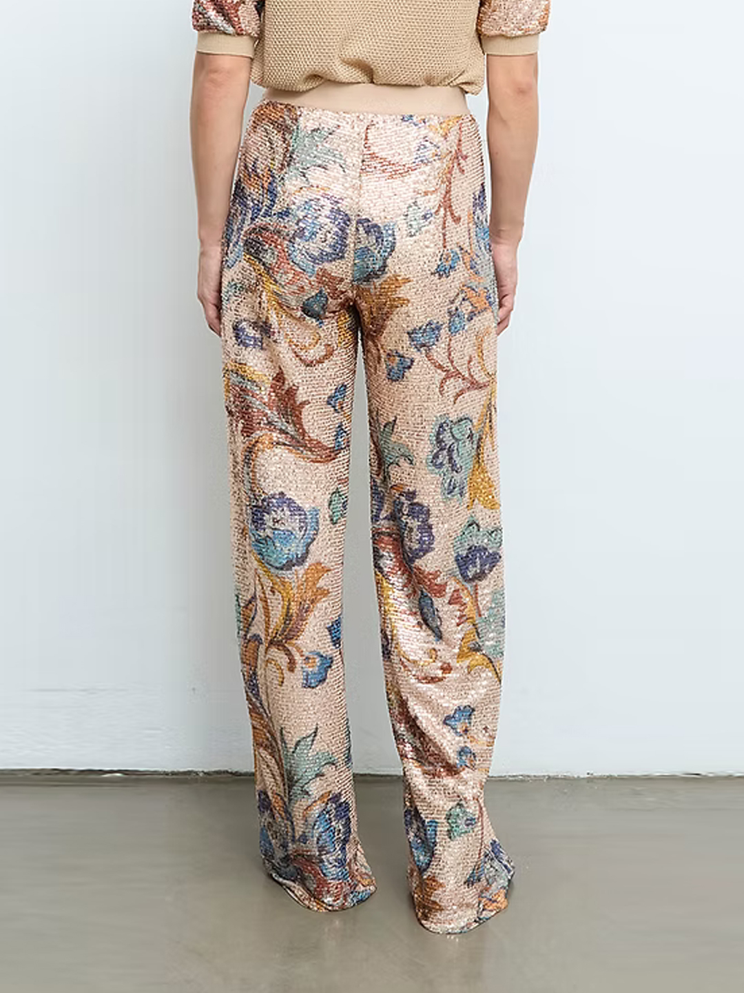 Pantalón Floreana de Aldo Martins. Confeccionado en PES e abelorios, pantalón longo de abelorios con rechamante estampado floral multicolor sobre base en ton nude. Presenta corte recto e caída fluída que estiliza a silueta e achega movemento á peza. Incorpora cintura con goma elástica que garante un axuste cómodo. O acabado de abelorios achega brillo e textura, converténdoo nunha peza orixinal, ideal para crear looks especiais. Se o teu é o total look, combínao ca chaqueta Jarvis.
