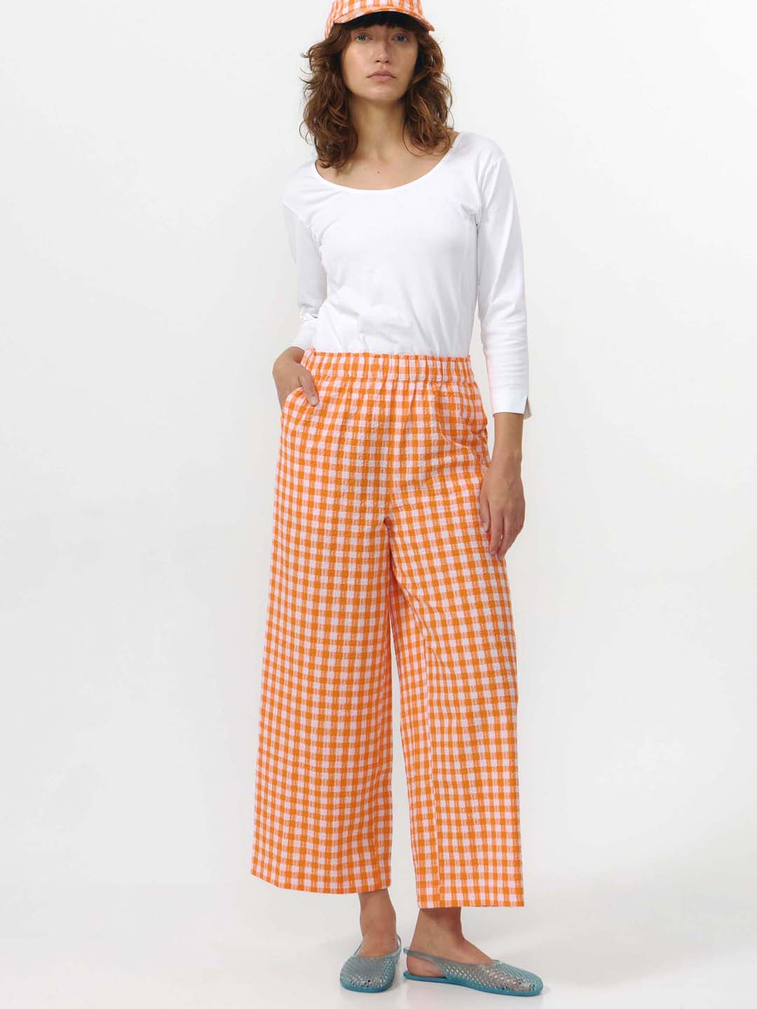 Pantalón Santa Check Orange de Suite 13 Lab. Pantalón culotte de cadros con perna ancha. Confeccionado en 100% algodón orgánico. Conta con petos dianteiros e banda elástica na cintura. É cómodo, transpirable e fácil de combinar. Unha opción sinxela que probablemente levarás máis do que pensabas.