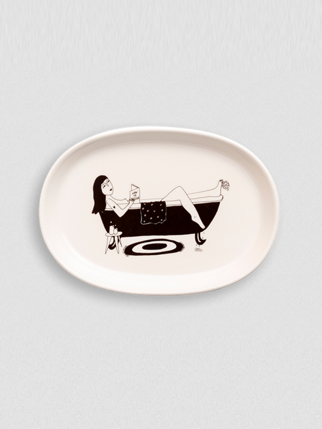 Prato de cerámica con ilustración en contraste negro de muller na bañeira. Feito a man.