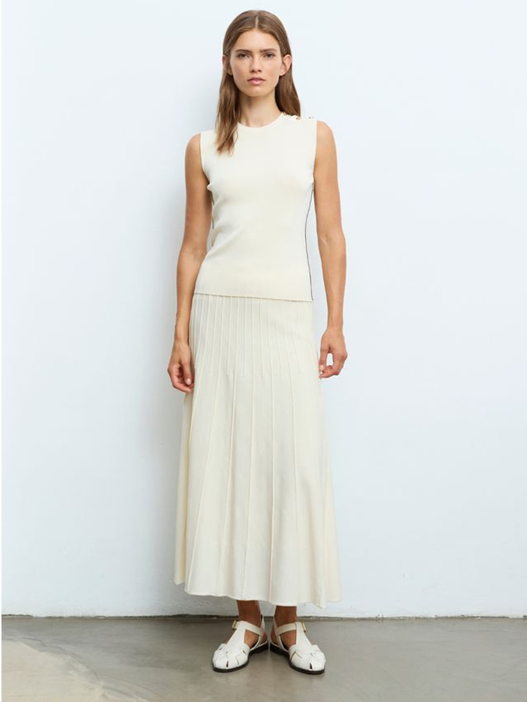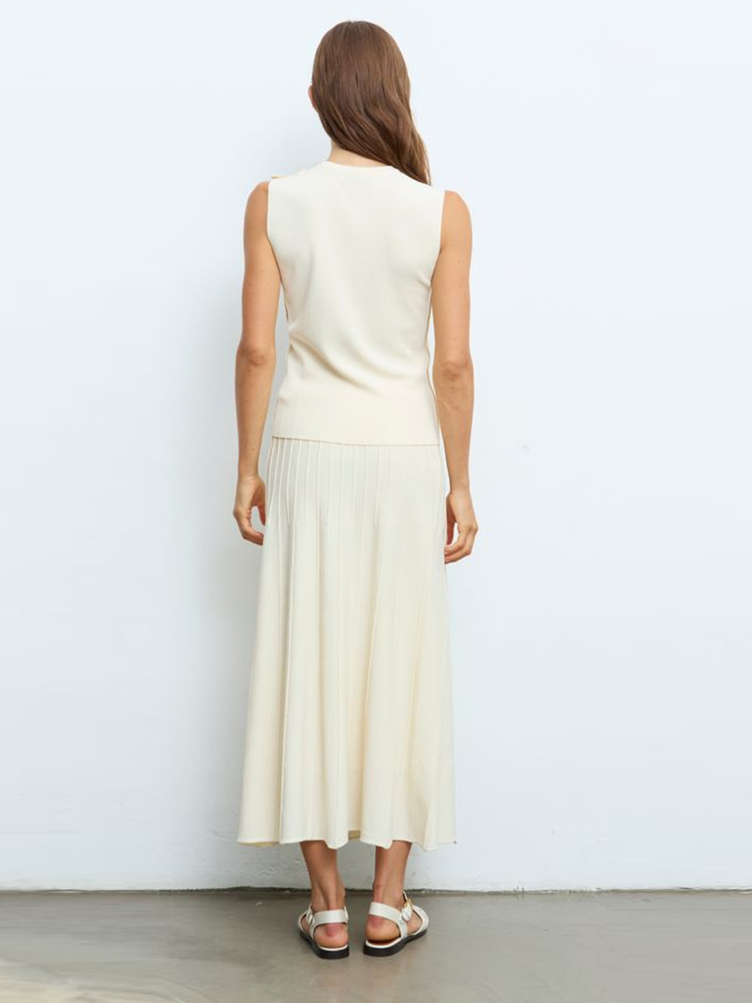 Saia Miyako de Aldo Martins. Confeccionada en punto de viscosa, saia longa de punto en ton cru con deseño de efecto plisado que achega movemento á peza. Presenta cintura elástica de punto que garante un axuste cómodo e favorecedor, adaptándose suavemente á silueta. O seu tecido de punto fluído e lixeiro ofrece unha caída natural que estiliza a figura. Unha peza versátil, ideal para crear looks relaxados e elegantes durante a tempada primavera-verán.