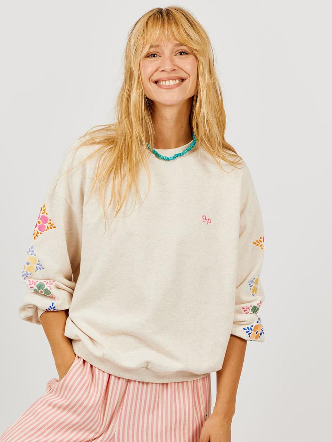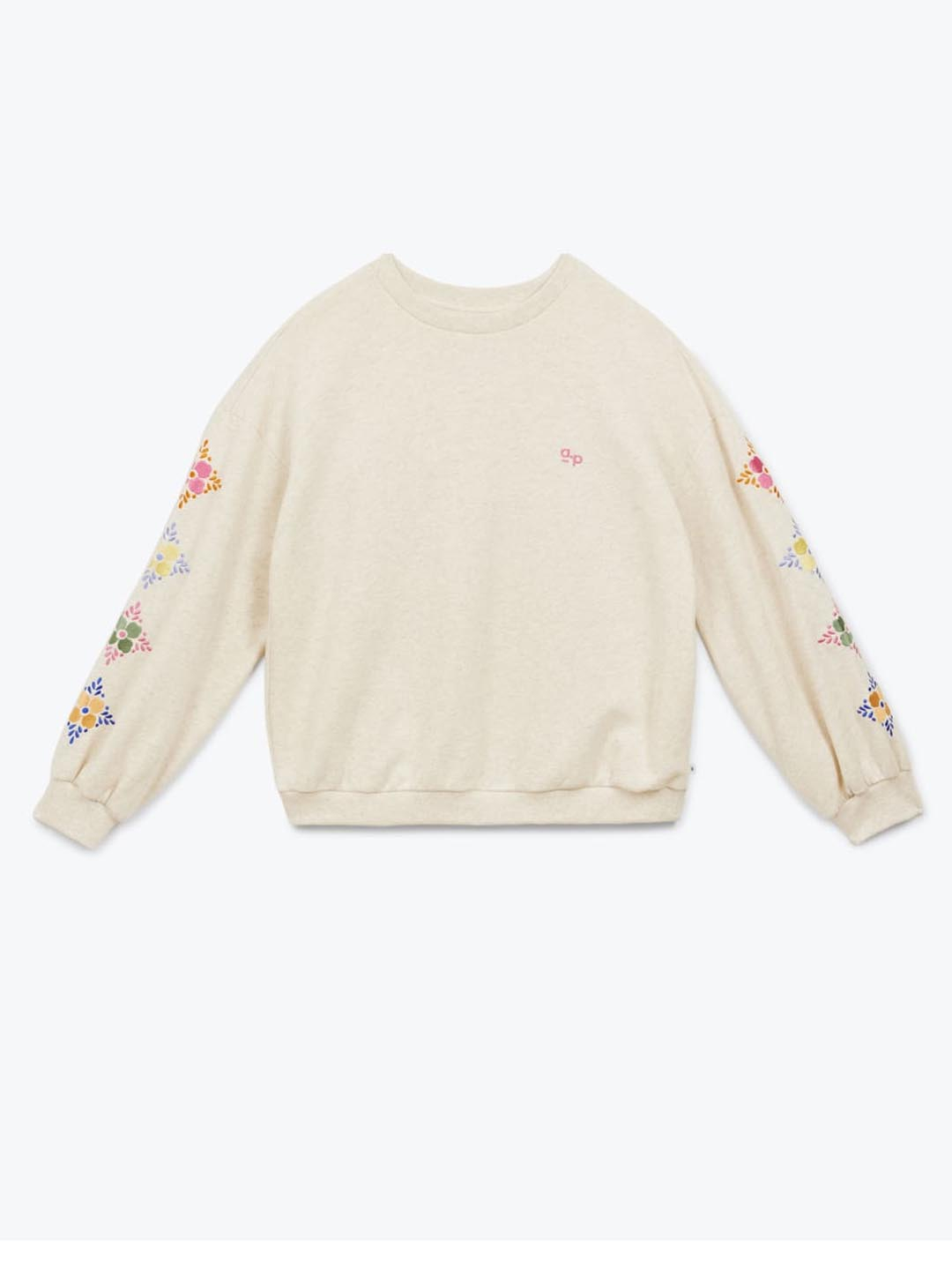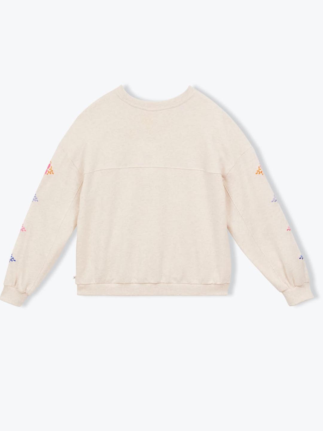 Suadoiro Sweet de Arsène & Les Pipelettes. Confeccionado en algodón orgánico e forro polar esmerilado. Suadoiro de corte folgado en cor area, cun bordado "AP" no peito e flores bordadas nas mangas. Leva pescozo redondo e os puños, baixo e pescozo son acanalados. Este suadoiro é o teu aliado nesta primavera / verán. Ademais leva un precioso bordado de flores en cores alegres.