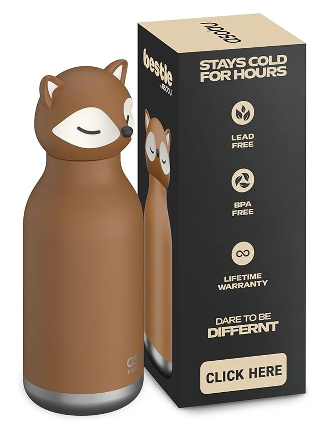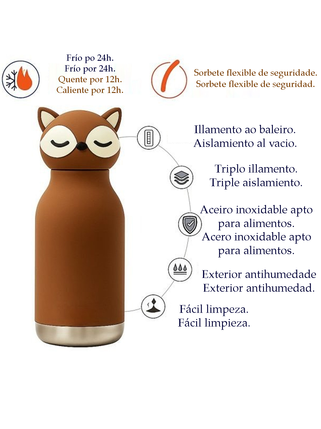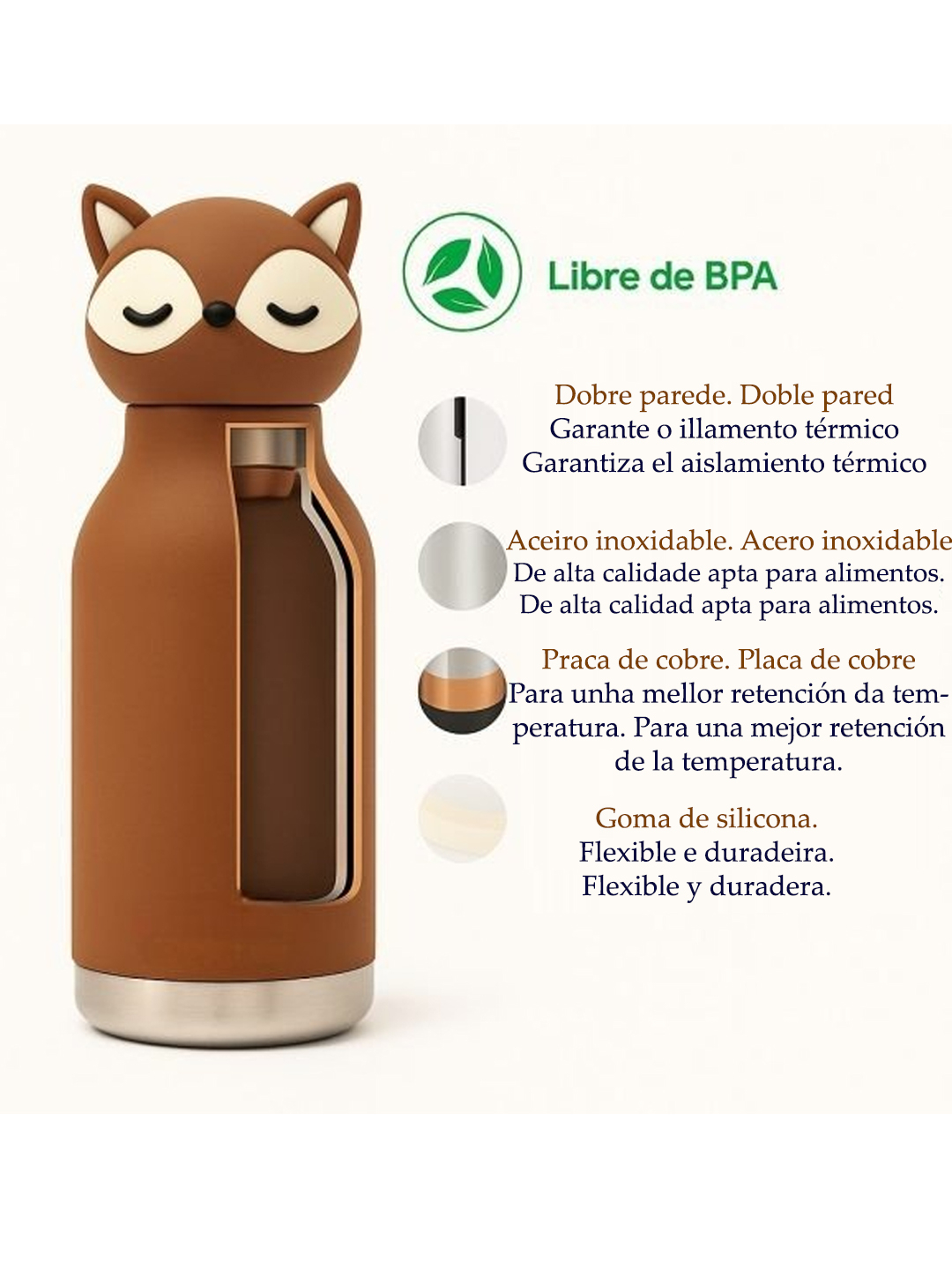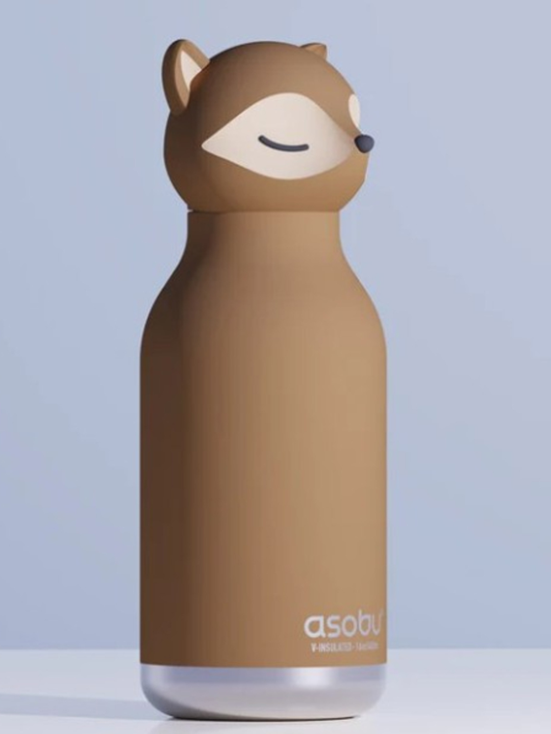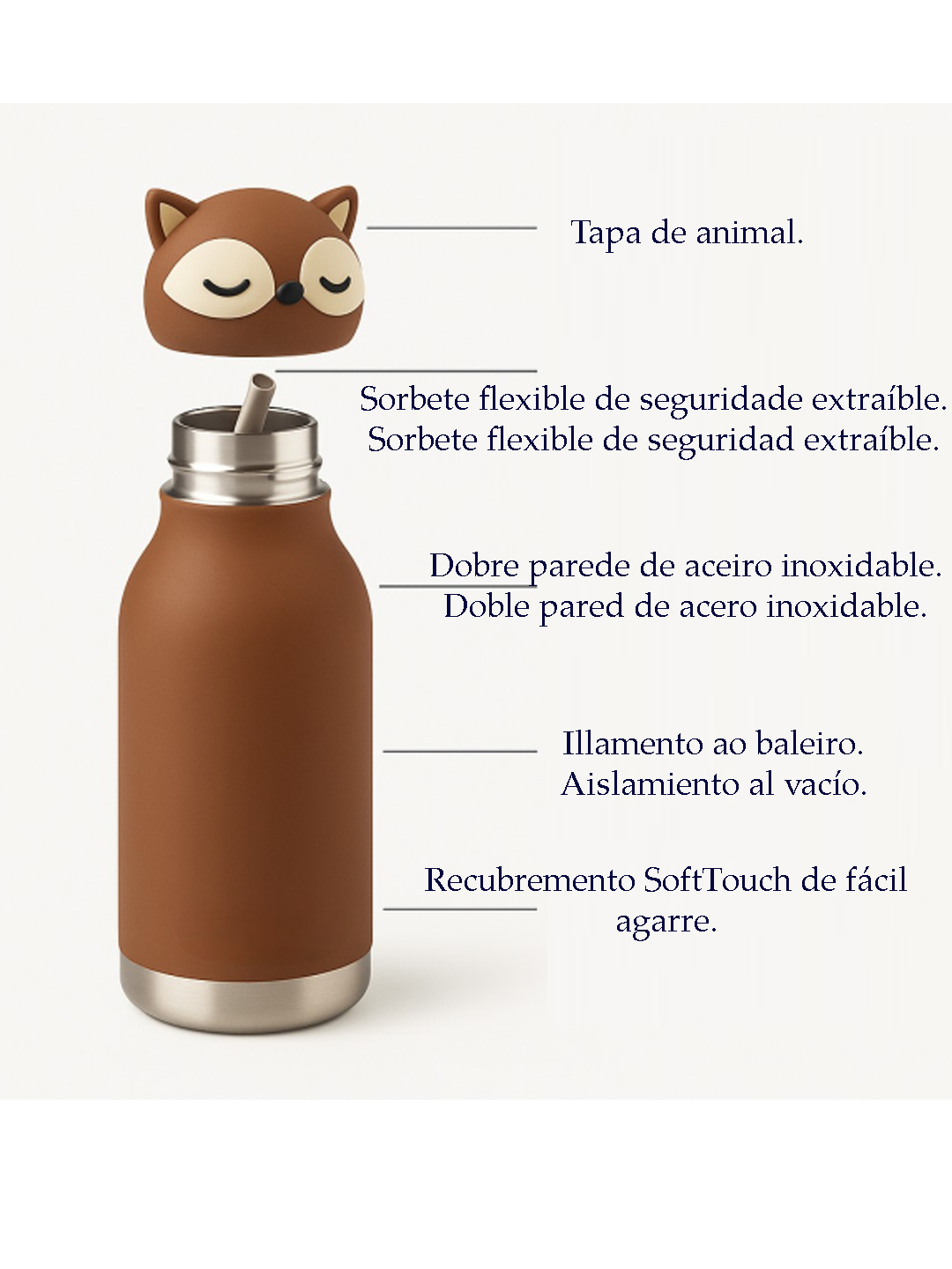 Termo raposo de Asobu. Estas adorables botellas de auga axúdanche a manterche hidratado todo o día e veñen cunha cabeza de personaxe de silicona extraíble e coleccionable que lle dá un toque divertido a cada sorbo. Grazas ao seu avanzado illamento ao baleiro de dobre parede, manteñen as túas bebidas frías até 24 horas, perfectas para calquera situación do día. Ademais, cun práctico tamaño de 473 ml , están deseñadas para caber comodamente no teu bolso ou portavasos, o que facilita levar a túa besta onde sexa que a vida che leve.