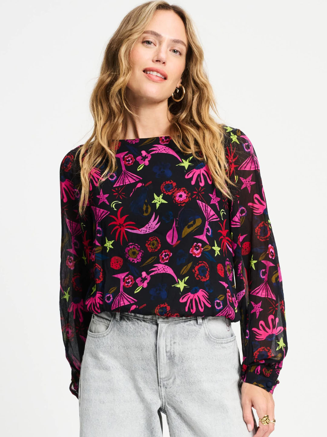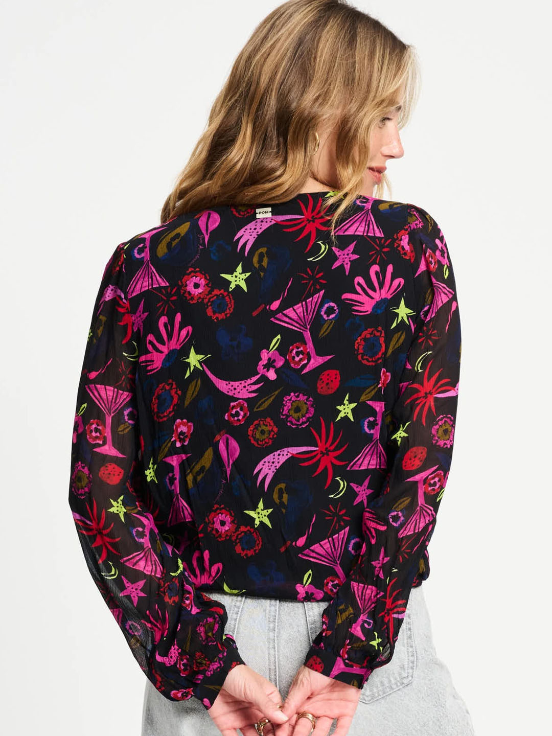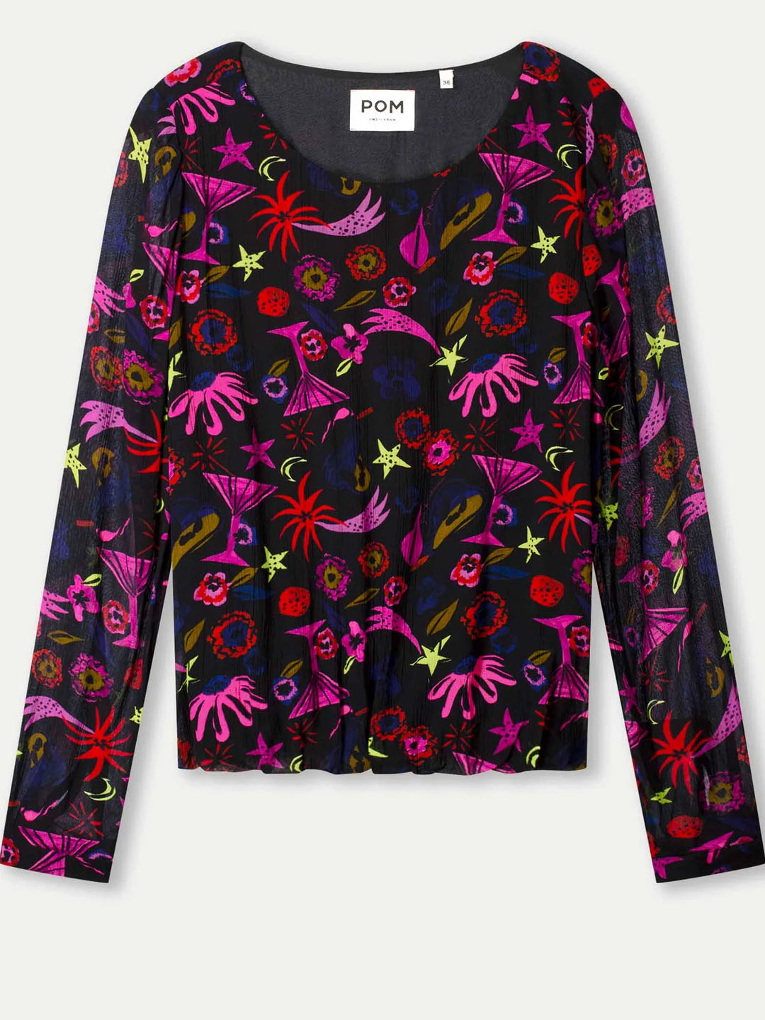 Top Party Delight de Pom Amsterdam, confeccionado nunha suave viscossa. Este top negro adquire un toque rechamante con ilustracións neón. Con pescozo redondo e corte recto, poderás pasar facilmente dun look casual a un festivo. As mangas son longas con puños estreitos e un botón. O baixo do top e elástico que lle otorga un sutil efecto globo e unha silueta lixeiramente vaporosa . O forro do top e dunha viscossa suave.