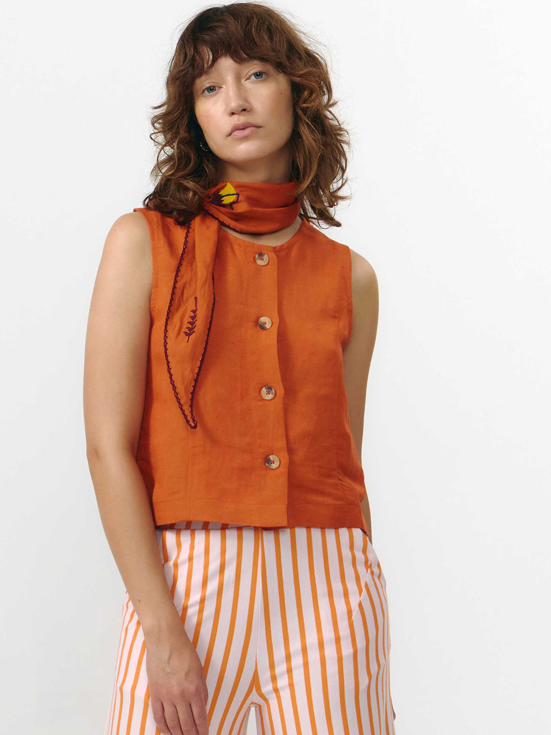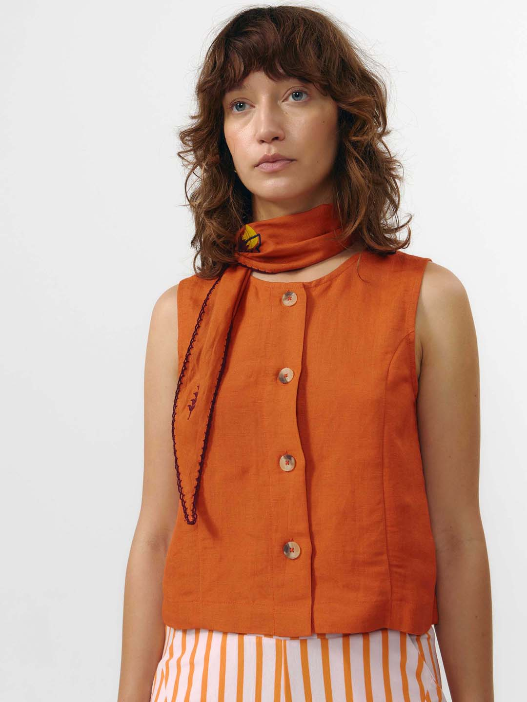 Top Fuji Henna de Suite13Lab, confeccionado nunha mixtura de liño e viscosa Livaeco.Top sen mangas 2 en 1 con pescozo redondo. Abróchase con botóns de corozo e podes levalo por ambos os lados, según o momento. O seu tecido é lixeiro, agradable ao tacto e cómodo para moverche con liberdade. Unha opción fácil que, sen darte conta, acabarás poñendolo máis do que imaxinas.