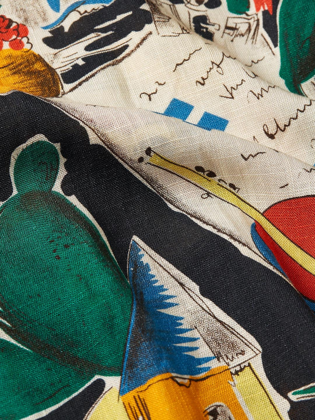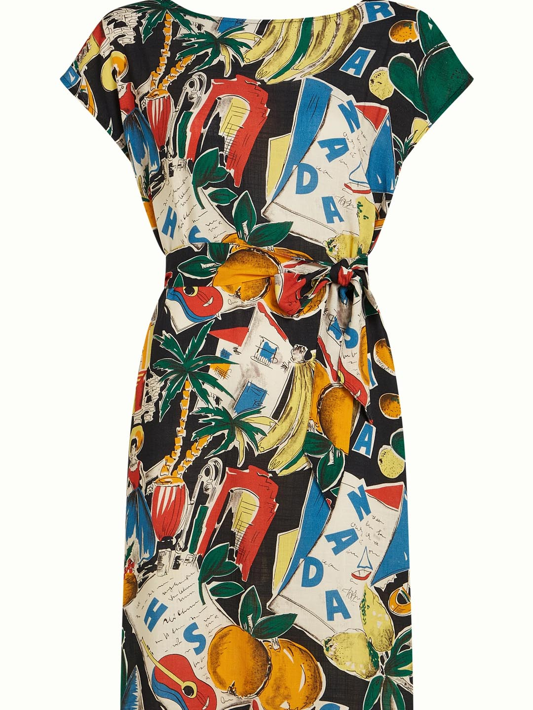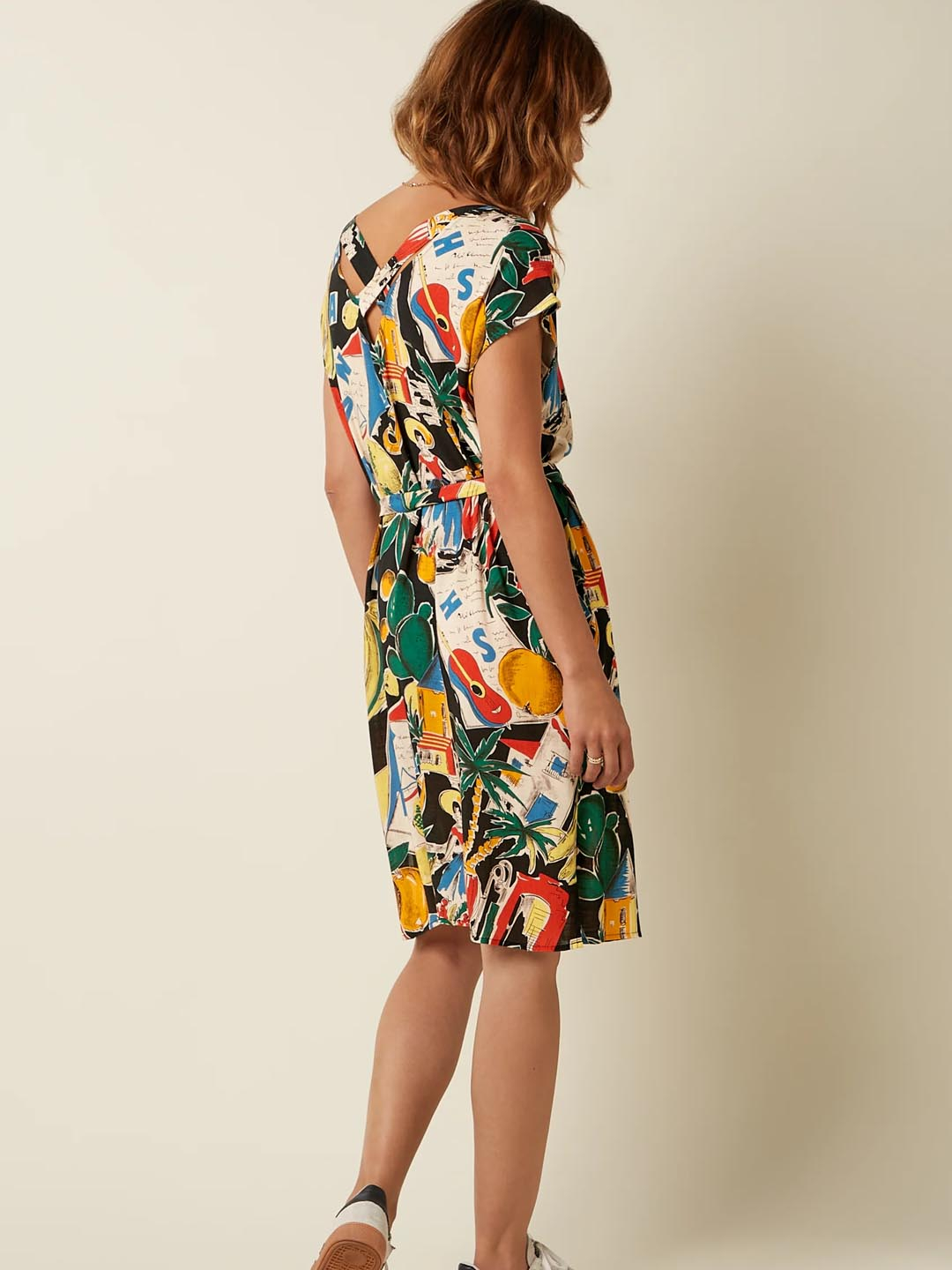 Vestido Manon Tropez de King Louie. Confeccionado en Lenzing Ecovero. Este vestido de escote redondo con manga curta é o vestido top para levar nos días de calor. O seu tecido non elástico é moi cómodo e fresco. A lonxitude é até o xeonllo. Ten un estampado moi alegre e o axuste é "regular fit".