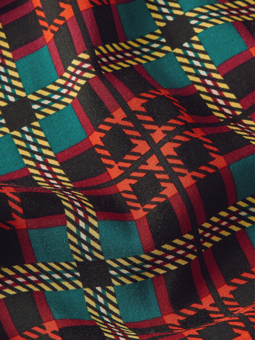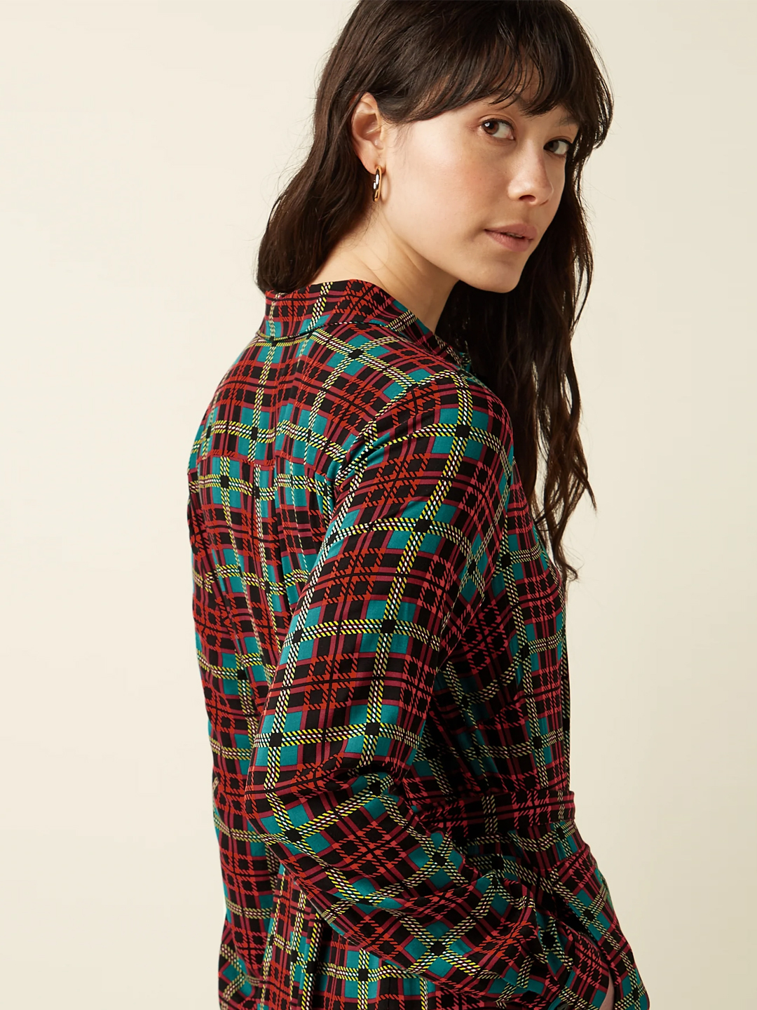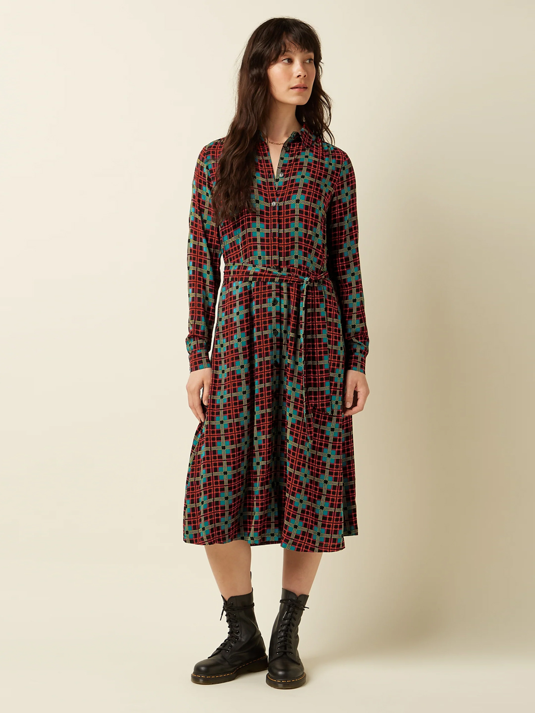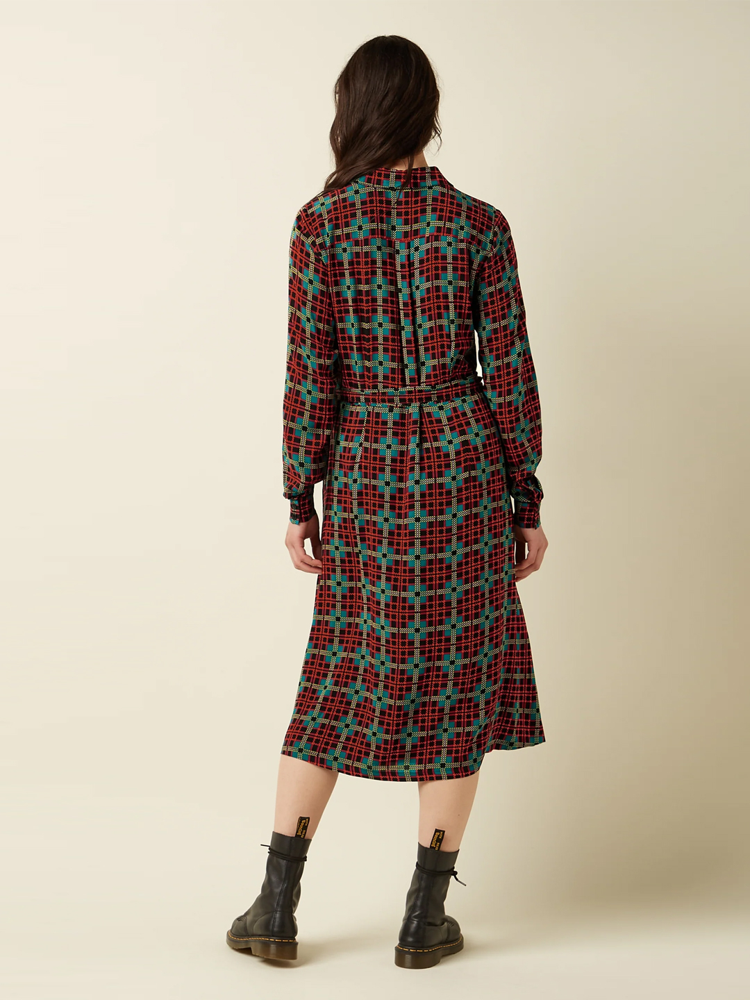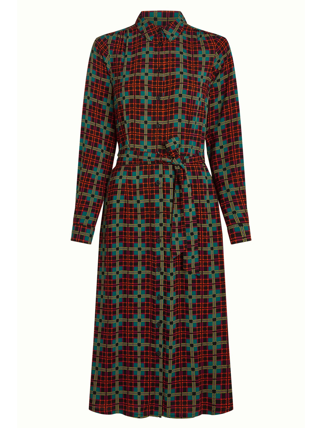 Vestido Olive Duna de King Louie. Confeccionado en Lenzing Ecovero, vestido midi acampanado con estampado de cadros. De manga longa con puño, pescozo clásico, pinzas no canesú e botonadura na parte central para unha elegancia atemporal.