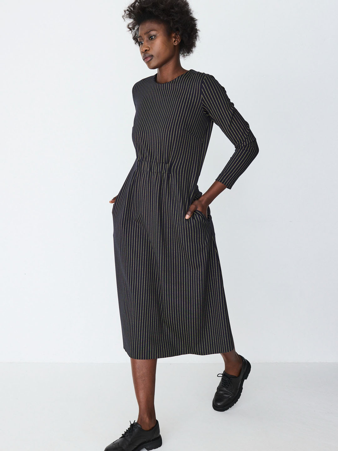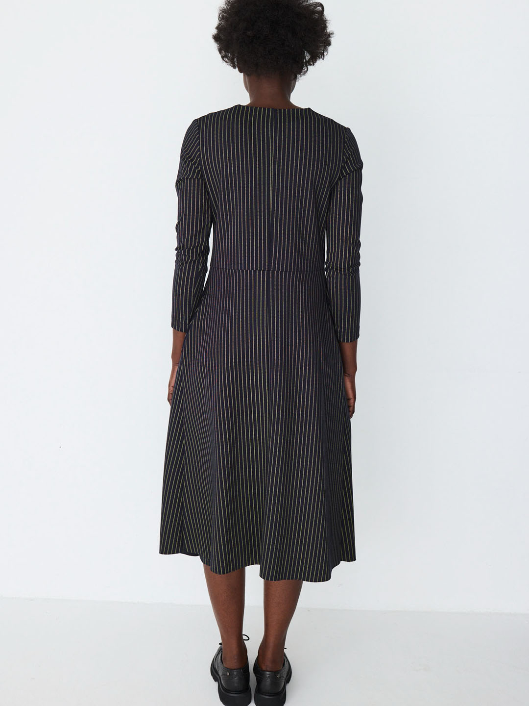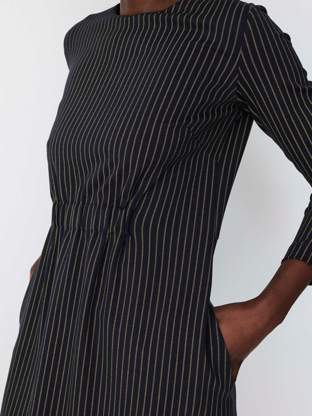 Vestido Vieja Phospho Stripes de Mónica Lavandera confeccionado nunha mistura de viscosa e poliamida. Este vestido midi de pescozo redondo e bolsillos laterales ten goma na cintura. Leva as raias en vertical que sempre estilizan a figura. As raias en verde danlle un toque de cor neste vestido negro de outono e inverno. Ademais e un vestido de edición limitada.