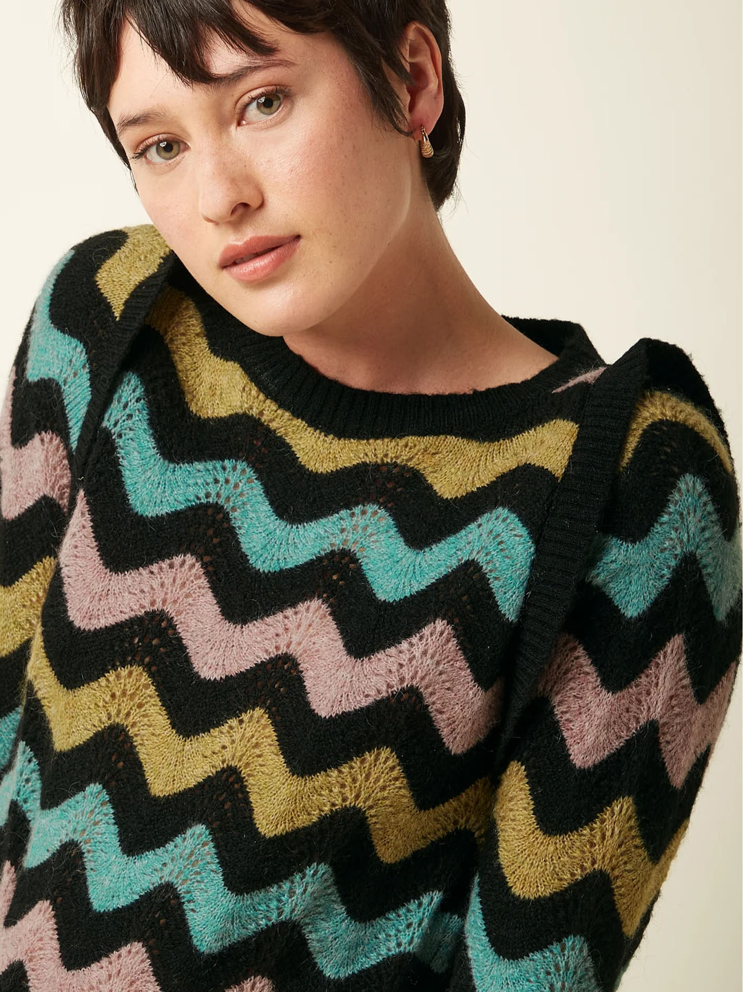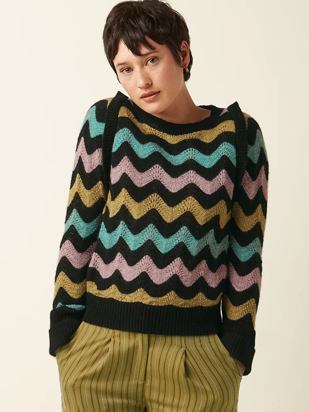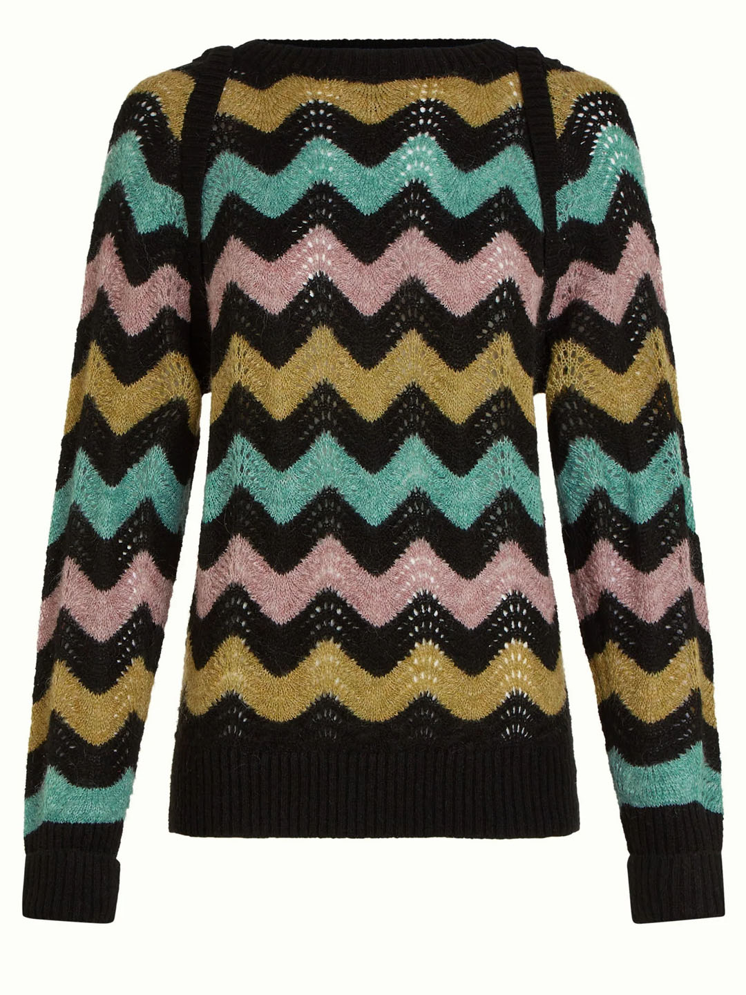 Xersei Aurelia Botanyz de King Louie, confeccionado nunha mixtura de acrílico, nailon e la. Este xersei de pescozo redondo cun punto único e mangas raglán de canalé con puños dobrados, está deseñado nun estampado en zigzag divertido para o noso día a día.