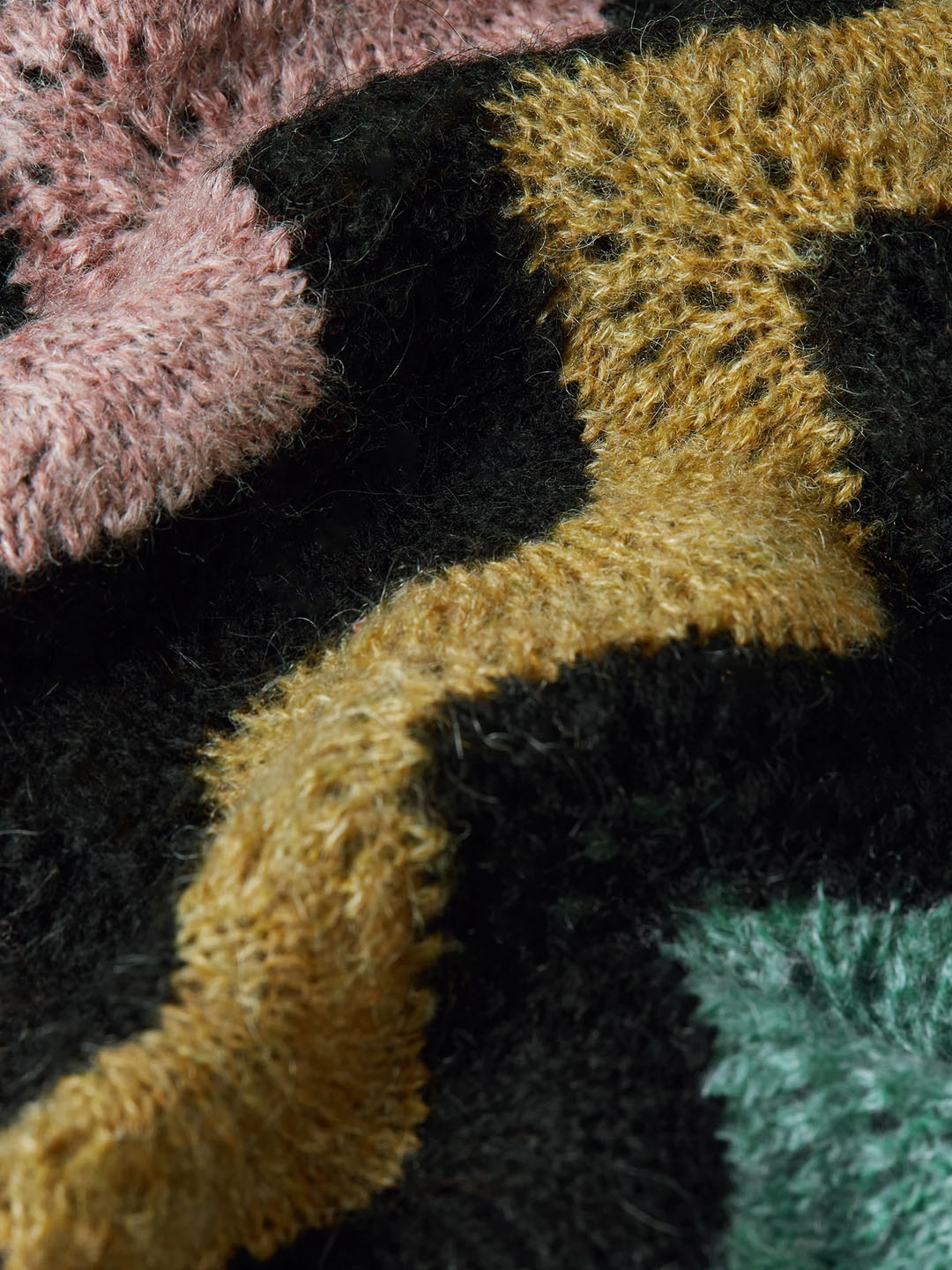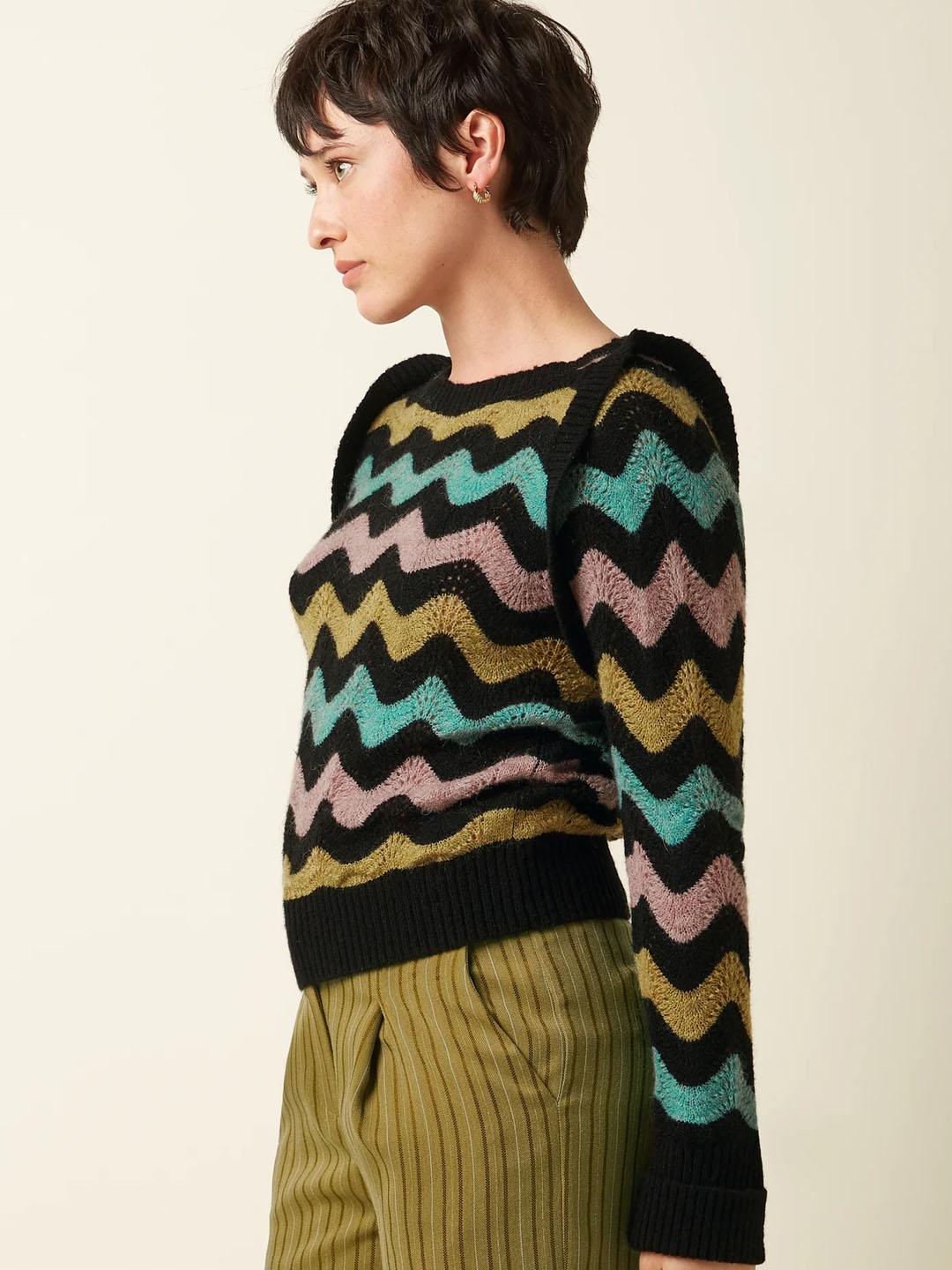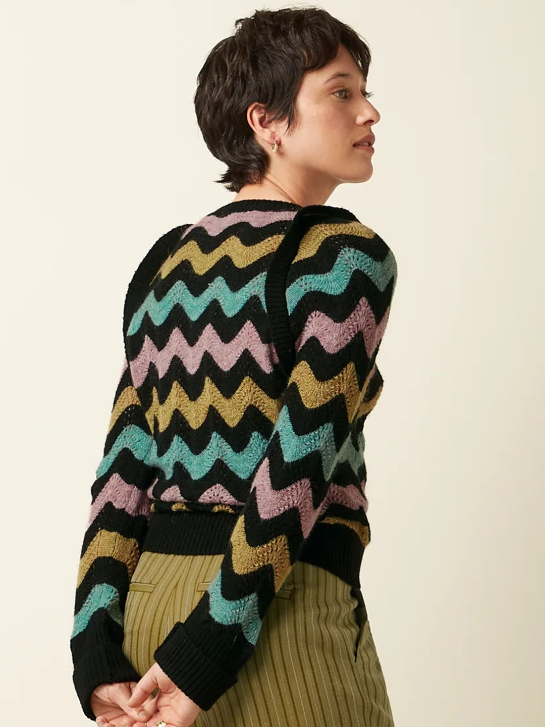 Xersei Aurelia Botanyz de King Louie, confeccionado nunha mixtura de acrílico, nailon e la. Este xersei de pescozo redondo cun punto único e mangas raglán de canalé con puños dobrados, está deseñado nun estampado en zigzag divertido para o noso día a día.