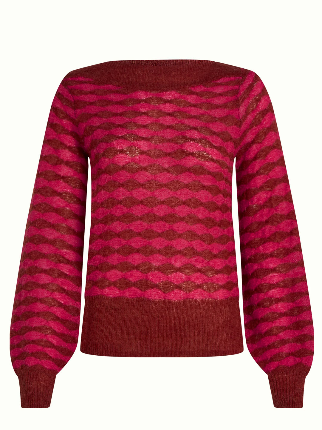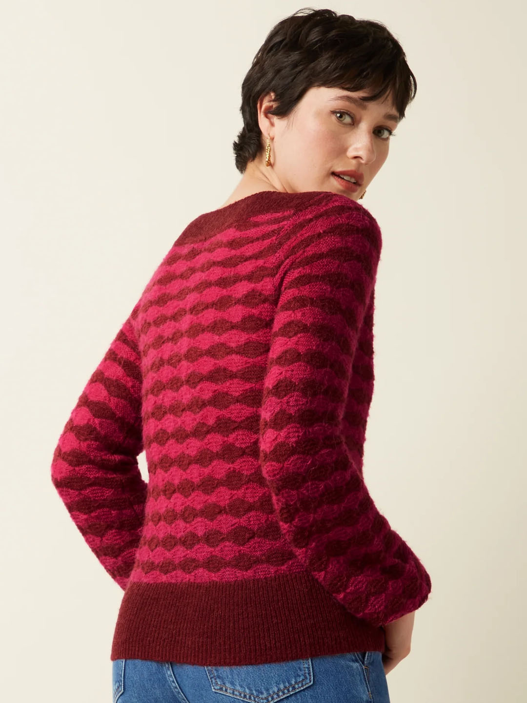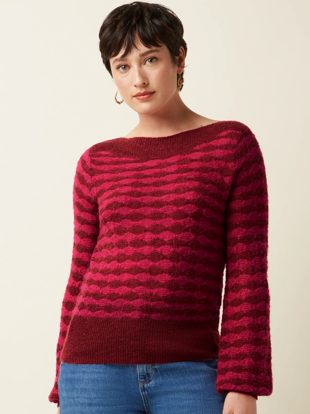 Xersei Erin Bell de King Louie confeccionado nunha mixtura de acrilico, nailon e alpaca. Este xersei está feito nun delicado punto ajour elástico, adornado cun refinado estampado gráfico. Ofrece mangas longas con elegantes puños e un favorecedor escote barco. Combinando unha sofisticación atemporal cunha gran comodidade.