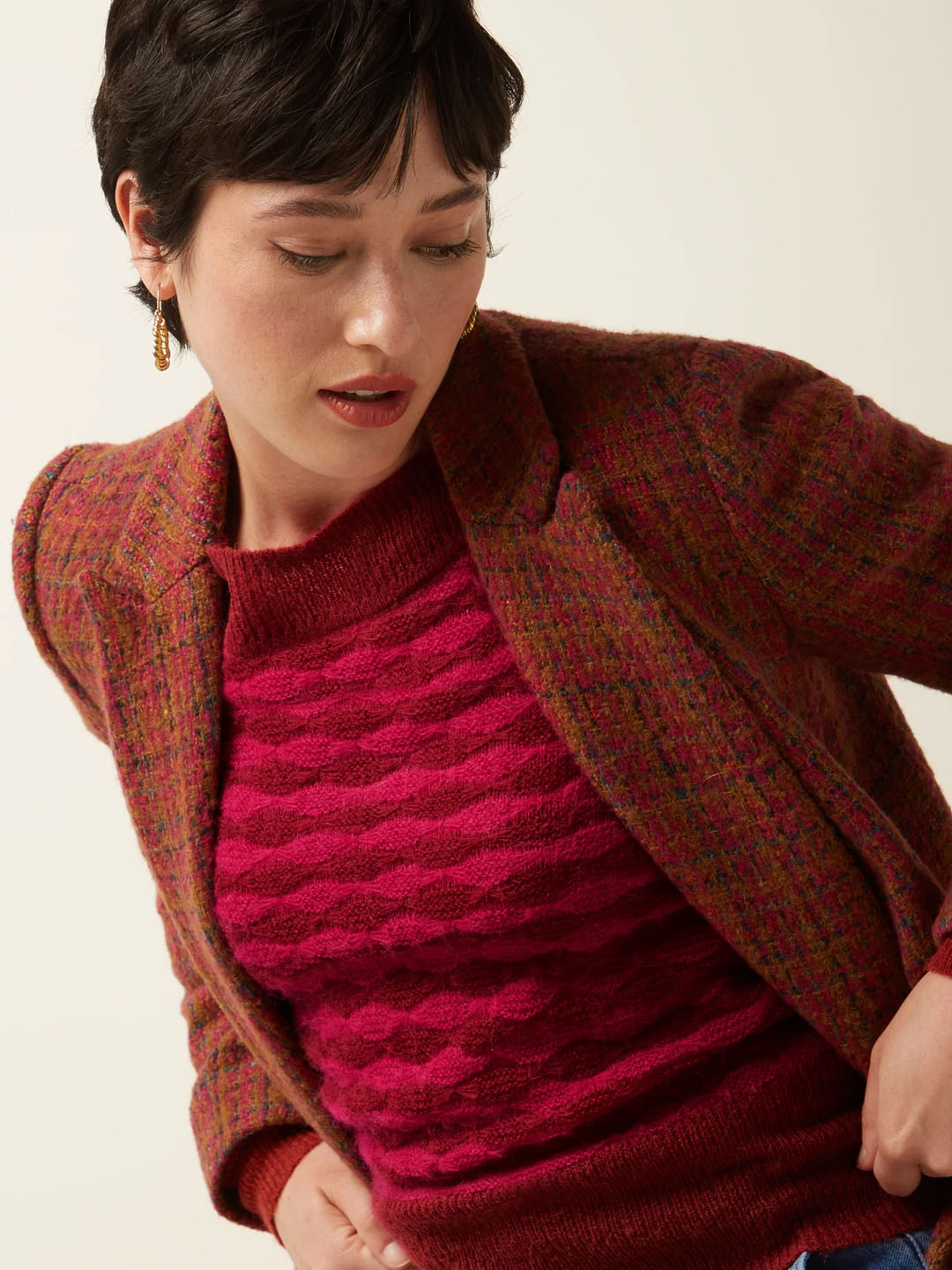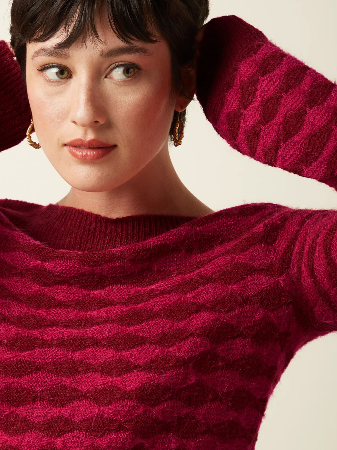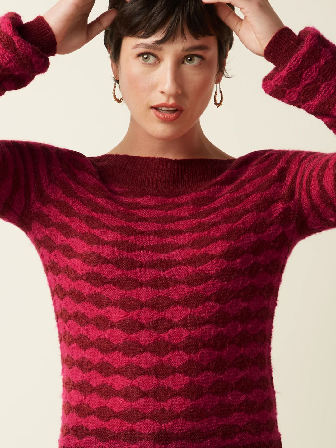 Xersei Erin Bell de King Louie confeccionado nunha mixtura de acrilico, nailon e alpaca. Este xersei está feito nun delicado punto ajour elástico, adornado cun refinado estampado gráfico. Ofrece mangas longas con elegantes puños e un favorecedor escote barco. Combinando unha sofisticación atemporal cunha gran comodidade.