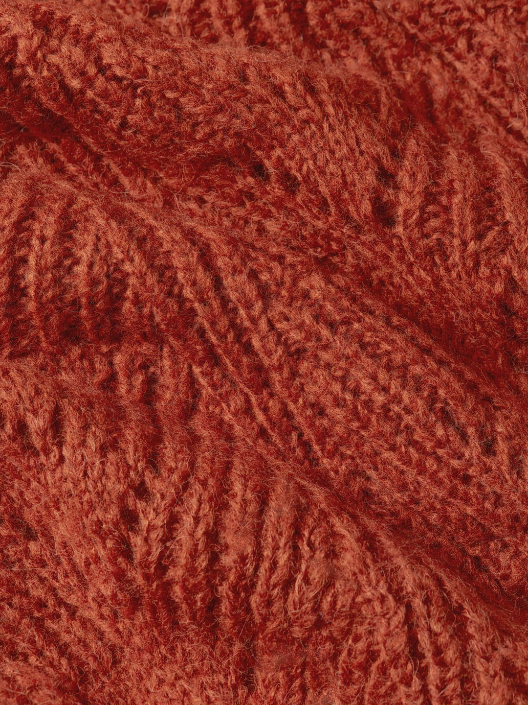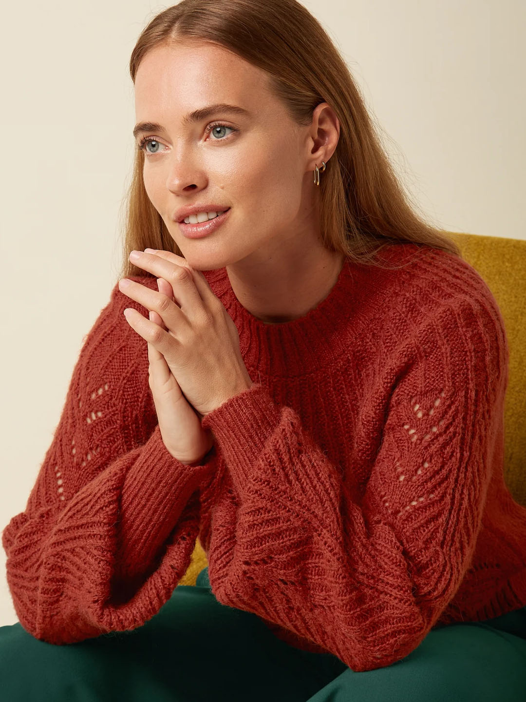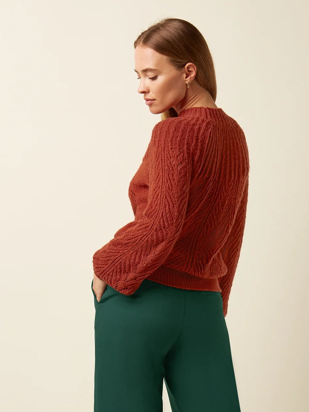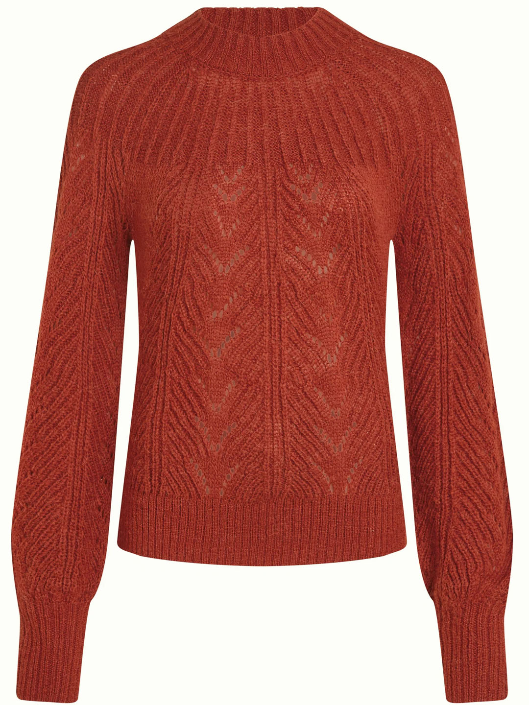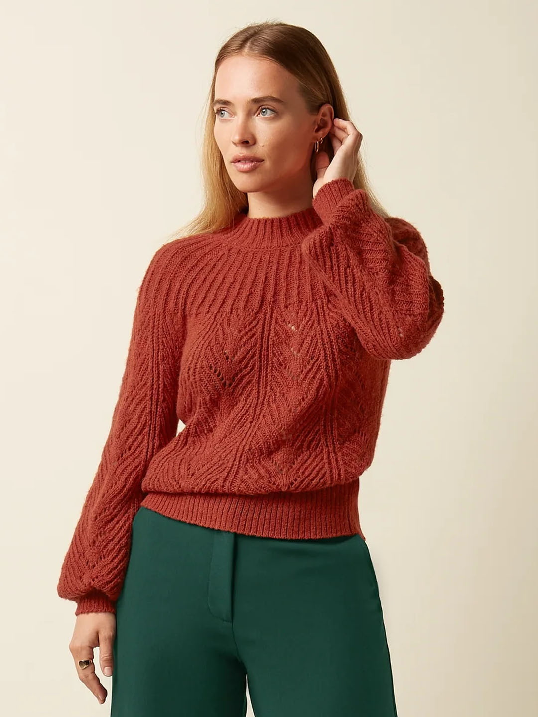 Xersei Joanie Orcia de King Louie. Confeccionado en unha mistura de acrílico, la e alpaca. Este xersei raglán combina un elegante canesú de punto aberto con detalles de punto calado, mangas longas e pescozo redondo. Esta peza ofrece comodidade e ten un corte favorecedor, perfecto para engadir a unha peza elegante. Este xersei transpirable non pode faltar no teu armario esta tempada de outono e inverno.