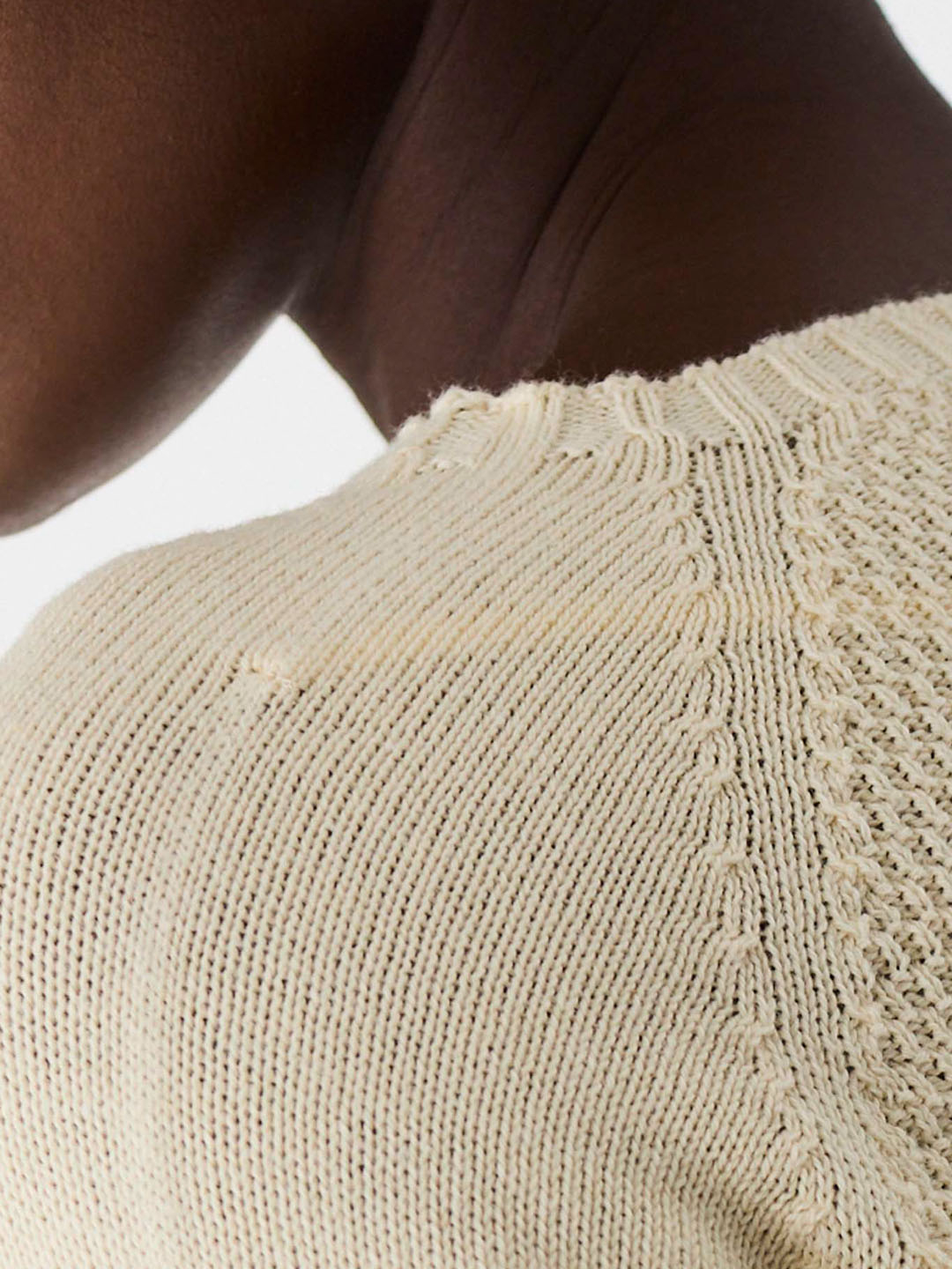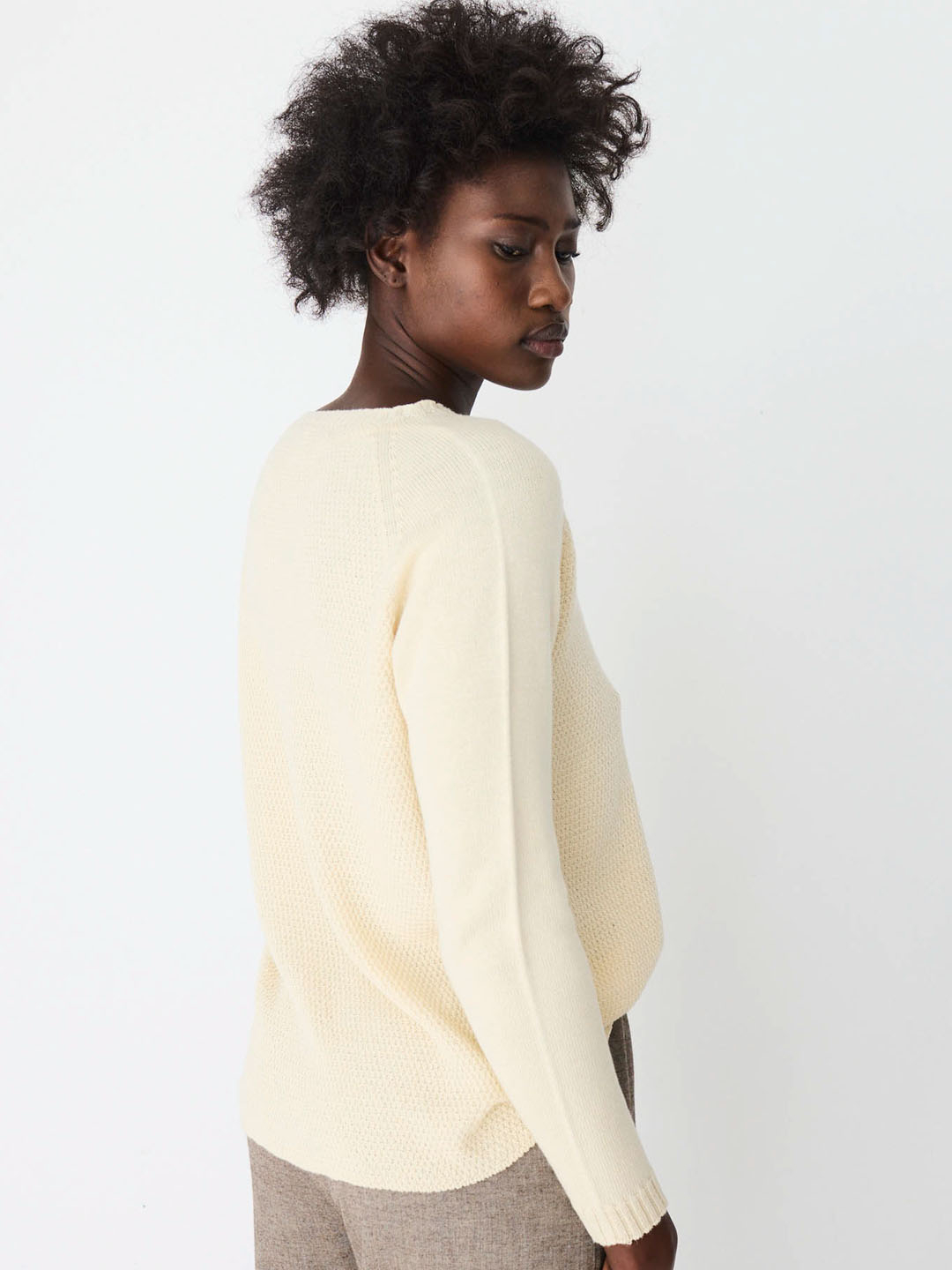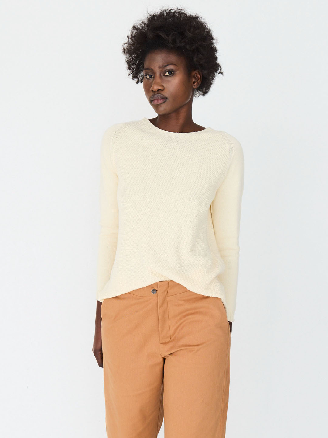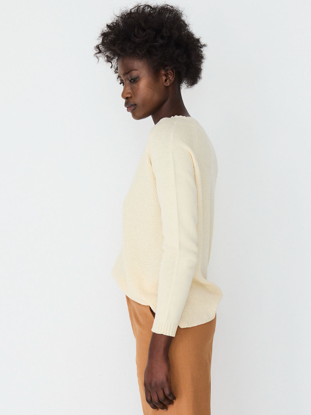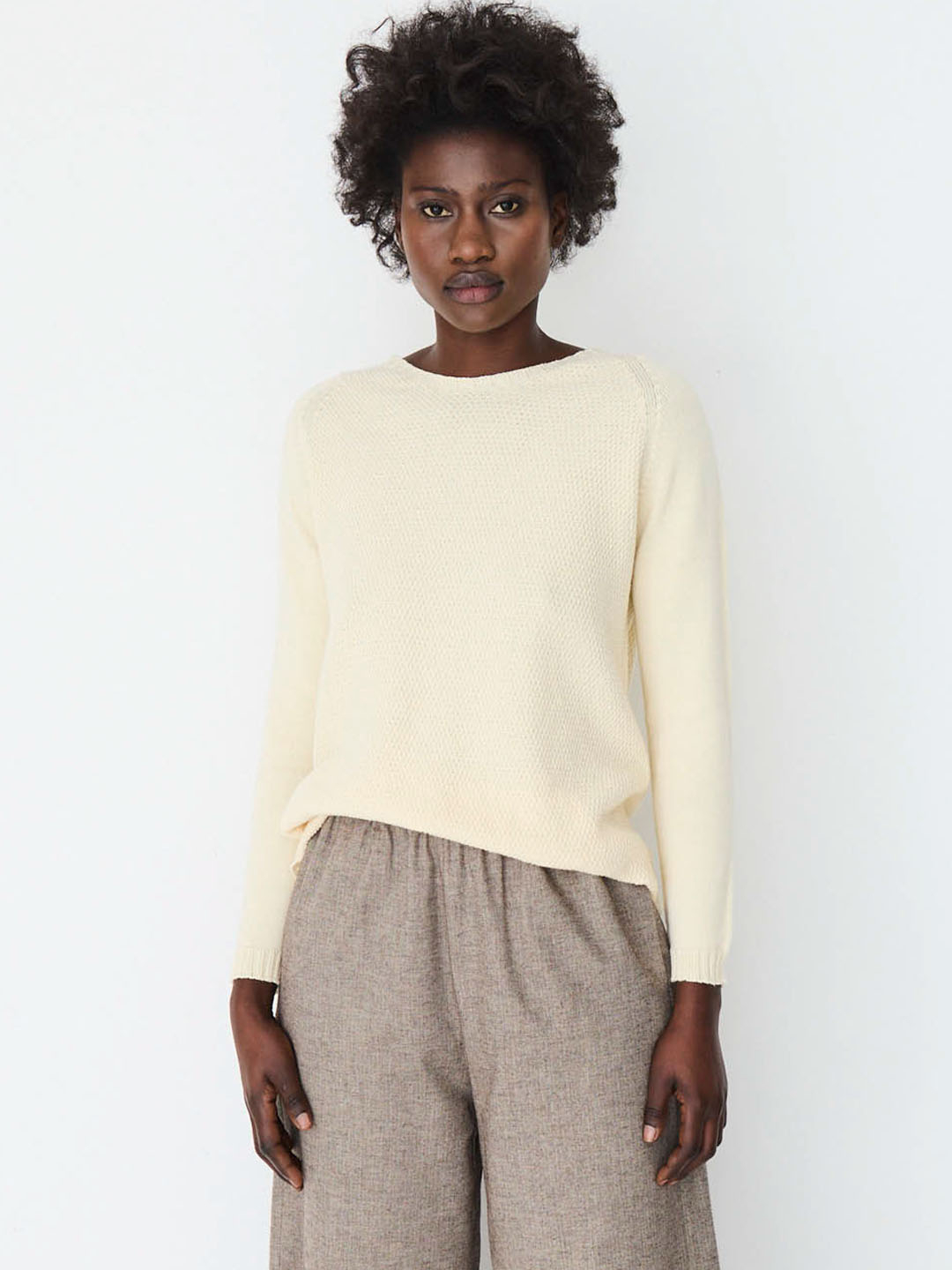 Xersei Julia Ivory de Mónica Lavandera confeccionado nunha mistura de algodón e la que fai que a prenda sexa moi cómoda de levar. E unha prenda que está fabricado en edición limitada. Ten un punto de red que lle otorga ese toque de elegancia. Xersei de cuello redondo e mangas longas. Moi doado de combinar.