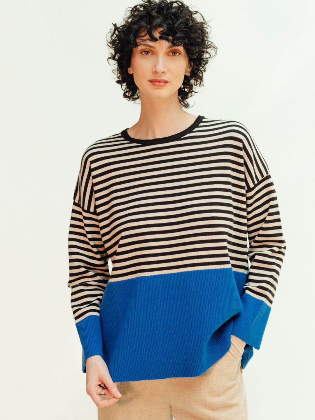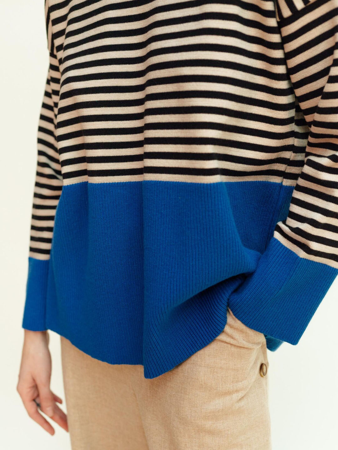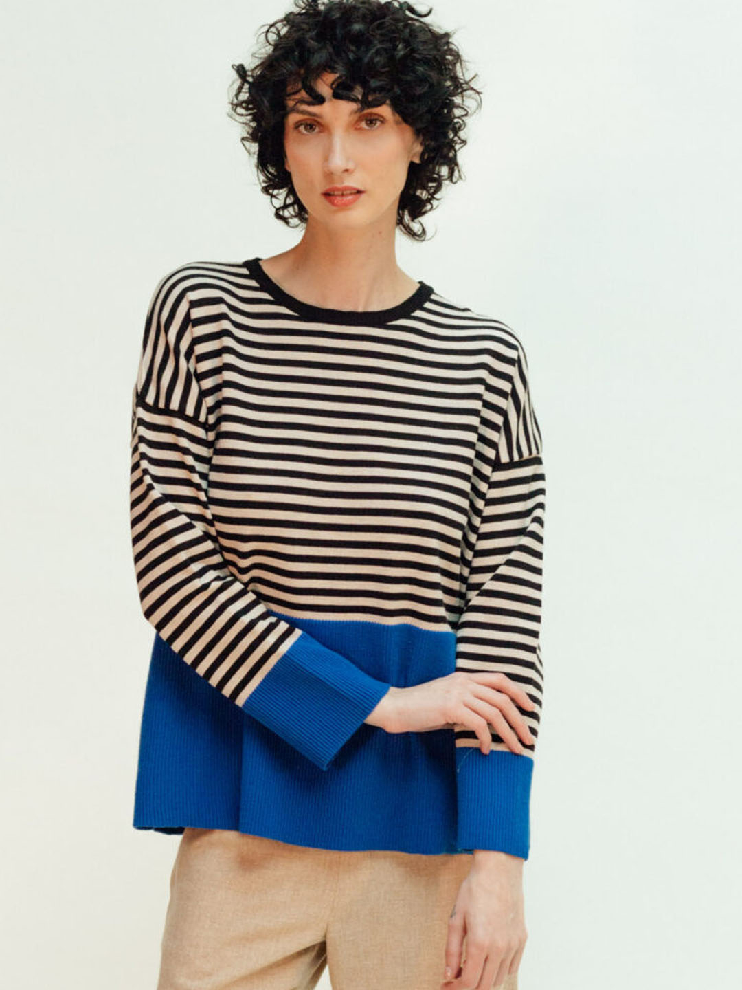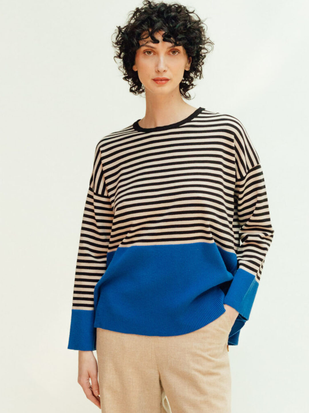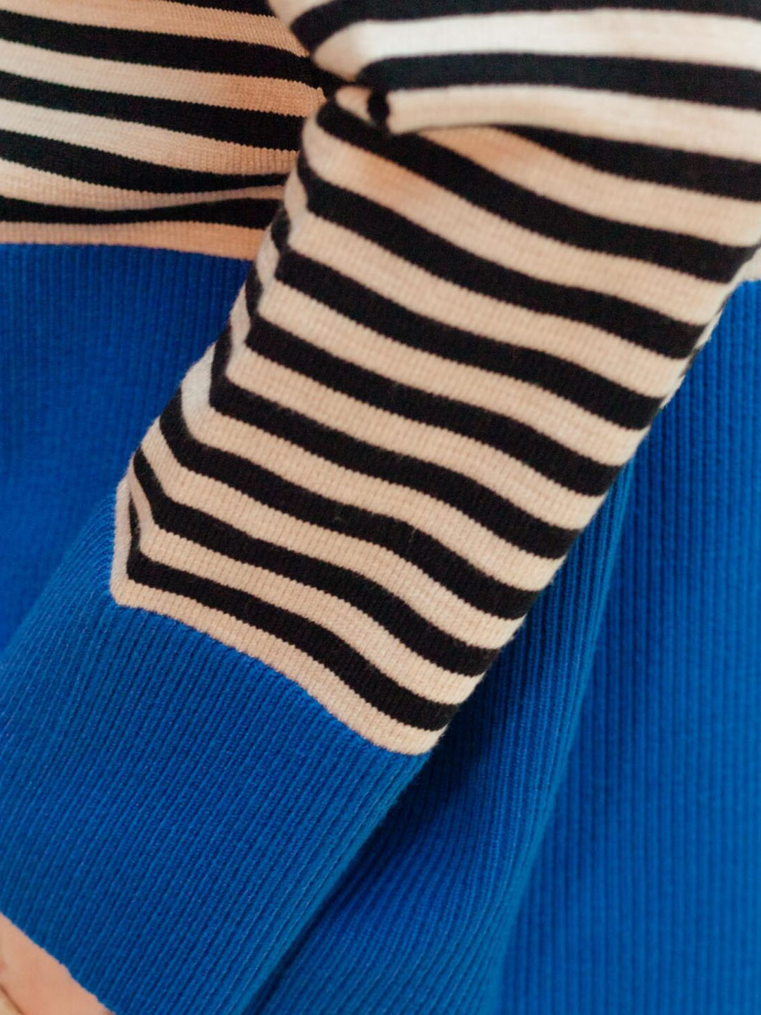 Xersei Sante de Pan Producto Básico. Confeccionado nunha mestura de viscosa, poliester e poliamida. Xersei de punto con pescozo redondo, mangas longas, corte recto e banda azul na parte inferior do corpo e nos puños, mentras que na parte superior leva un diseño de raias brancas e negras. E un xersei de corte moderno para o teu día a día.